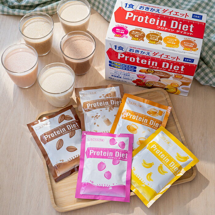 大人気“おきかえ食”の定番ドリンク。1食169kcal以下で美容とスタイルをダブルサポート!『DHCプロティンダイエット』は、ダイエットおきかえ食として大人気『プロティンダイエットシリーズ』の定番ドリンクタイプです。健康的なダイエットに欠かせないたんぱく質には、植物由来の大豆たんぱくと、動物由来の乳たんぱくをダブルで採用し、バランスよく配合しています。さらに、食物繊維やヒアルロン酸、コエンザイムQ10をプラスし、ダイエット中のキレイと健康をサポートします。やさしい甘みのコクとボリューム感なのに、すっきりとした口あたり。毎日飲んでも飽きのこない、5種のフレーバーをご用意しました。気分に合わせて、日替わりでお楽しみください。『DHCプロティンダイエットシリーズ』について減量者率95.5%※1の大人気ダイエットおきかえ食。毎日の食事とおきかえるだけで、1食に必要な※2栄養素を補いながら、カロリーを大幅にセーブできます。さらに、多彩な美容サポート成分が、キレイヤセをバックアップします。ドリンクだけでなくリゾットやケーキなど、バリエーションも豊富! しかもおいしいから飽きずに、楽しくスリムを目指せます。ダイエット中に摂りたい栄養・成分がバッチリ1回の食事に必要な※2ビタミン11種類、ミネラル11種類に加えて、たんぱく質、食物繊維も充実配合! カロリー制限時に不足しやすい栄養素をきちんと摂取でき、健康的なダイエットをサポートします。【[図1][図2]に関して】※厚生労働省「日本人の食事摂取基準(2020年版)」より 20代女性の推定平均必要量・目安量・目標量・カロリーにおいては推定エネルギー必要量(身体活動レベルII)を基準に1日の食事を3回として算出し、数値を100%として換算。※1 2015~2017年に「DHCプロティンダイエット」で、1日1~2食の食事おきかえを3カ月継続した対象者112名(男女24~58歳)の体重測定結果報告を集計し、開始時の体重より0.1kg以上減少が認められた人数構成率より。DHCによる食事および健康指導サポートやプロティンダイエット以外のDHC商品も併用してダイエットをした結果です。※2 厚生労働省「日本人の食事摂取基準(2020年版)」より算出アミノ酸スコアは最高値の100!アミノ酸スコアは、たんぱく質の栄養価を示す数値。値が100に近いものほど、理想的なアミノ酸バランスをもつたんぱく質食品であるといえます。『DHCプロティンダイエット』は、良質なたんぱく質を理想的なアミノ酸バランスで配合した、“アミノ酸スコア100”の高たんぱく質食品です。ダイエット時に積極的に摂りたいたんぱく質をしっかりと補え、いきいきとした健康的な美しさが目指せます。お召し上がり方『DHCプロティンダイエット専用シェーカーコップ』<別売>、または600ml程度入るシェーカーと、水350mlをご用意ください。1.シェーカーに水(350ml)を入れます。2.DHCプロティンダイエット1袋をシェーカーに入れます。3.シェーカーのふたをかたく閉め、よくシェークしたら、できあがり。※お好みにより氷を入れたり、水の量を調節したりしてください。※シェーカーを使用しない場合は、お手持ちのカップなどに入れ、よくかき混ぜて召し上がることもできます。ただし、シェーカーを使用した方がきれいに溶けます。■ホットでも美味しく、お召し上がりいただけます!(A)シェーカー&レンジで『DHCプロティンダイエット専用シェーカーコップ』<別売>、または450ml程度入るシェーカーと、水250ml、電子レンジ対応のマグカップなど(450ml程度入るもの)をご用意ください。1.シェーカーに水(250ml)とDHCプロティンダイエット1袋を入れます。2.シェーカーのふたをかたく閉め、よくシェークします。3.マグカップなどに移し替え、電子レンジで温めればできあがり。(目安:500Wで2分、600Wで1分30秒)(B)お湯で450ml程度入る耐熱性のマグカップなどと、沸騰直後の熱湯250ml、スプーンをご用意ください。1.マグカップなどにDHCプロティンダイエット1袋を入れます。2.熱湯を分量の1/3程度注ぎ、スプーンでダマをつぶすようによくかき混ぜます。3.残りの熱湯を少しずつ加えながら、さらにかき混ぜたらできあがり。※お好みにより水や熱湯の量を調節してください。また、溶け残りがないようによく混ぜてください。※冷めると風味が落ちますので、温かいうちにお召し上がりください。※やけどの危険性があるため、シェーカーに熱湯を入れて使用しないでください。※調理時、お召し上がり時の熱湯でのやけどには充分注意してください。※1日3食のうち1食または2食を食事のかわりにお召し上がりください。過度のダイエットを防ぐため、1日2食を限度としてください。※個包装開封後は、なるべく早くご使用ください。また、作り置きはせず、早めにお召し上がりください。※原料由来の赤い斑点が見られることがありますが、品質に問題はありません。※色調が異なる場合がありますが、品質に問題はありません。【内容量】15袋入(5味×各3袋)■成分・原材料【名称】