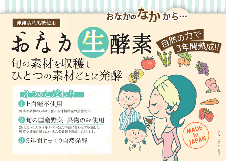 【必須記載事項】 1)広告文責:有限会社イーシー・コミュニケーションズ TEL.03-6300-0122 2)販売元:オンガネジャパン株式会社 3)製造国:日本 4)商品区分:健康食品 (人気ワードご紹介:)おなか生酵素 通販 720ml ファスティングダイエット 美容健康 酵素ドリンク 販売店:楽天イーエステshop あなたの健康を「腸活」でサポート! 岡山県産をはじめとする、75種類の旬の野菜・果実などを発酵熟成させて作った 「おなか生酵素」です。 朝食の置き換えや、ファスティング「断食中」のサポートにおススメです。 野菜・果物は「旬の時期」にこだわってます♪ 沖縄県産の上白糖のみを使用し、 旬の食材野菜、果物だけを、 モンゴル由来の乳酸菌で3年間も自然発酵させているこだわりの酵素ドリンクです。 ファスティング「断食中」のサポートとしてオススメ♪ ◆商品名 :おなか生酵素 ◆内容量 :720ml ◆原材料:イソマルトオリゴ糖シロップ、植物発酵エキス(黒砂糖、キャベツ、イチゴ、リンゴ、ダイコン、トマト、ユズ、カキ、キウイフルーツ、キュウリ、ナス、ホウレンソウ、 小松菜、ピーマン、セロリ、ゴーヤ、シソ、ニンジン、プルーン、ヨモギ、大豆(遺伝子組み換えでない)、オリゴ糖、ブドウ、ミカン、モモ、カボチャ、レイシ、日本山人参、大麦若葉、ケール、玄米、コンブ、スイートコーン、モロヘイヤ、キンカン、米ぬか、シイタケ、レモン、キクラゲ、ココア、根コンブ、ヒバマタ、ワカメ、ブルーベリー、アカメガシワ、アケビ、オオバコ、クマザサ、ヤマモモ、スギナ、ビワの葉、ヒジキ、マイタケ、ナシ、チンゲンサイ、ウメ、ウコン、レンコン、イヨカン、ビタミン菜、イチジク、ゴボウ、ヤマブドウ、ブロッコリー、ショウガ、アスパラガス、カリン、パセリ、セリ、キイチゴ、ミツバ、ミョウガ、グミ、グラックベリー、冬イチゴ)、レモン濃縮果汁、(原材料の一部にリンゴ、キウイフルーツ、大豆、モモを含む。) ◆賞味期限:540日 ◆単品サイズ:縦79mm×横79mm×高さ307mm ◆重量:1300g ◆製造国 :日本 ご使用上の注意 ●アレルギー表示:リンゴ、キウイフルーツ、大豆、モモ