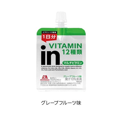 お店TOP>健康食品>栄養・美容系飲料>ゼリー飲料>ゼリー飲料全部>森永製菓 inゼリー (6個入×2セット/3セット)商品区分:栄養機能食品(栄養成分:グレープフルーツ味・パイナップル味:ビオチングレープ味:鉄、カルシウム、亜鉛、銅)【森永製菓 inゼリーの商品詳細】●飲むゼリータイプの栄養補助食品です。【栄養成分(栄養機能食品)】グレープフルーツ味・パイナップル味:ビオチングレープ味:鉄、カルシウム、亜鉛、銅【保健機能食品表示】★グレープフルーツ味・パイナップル味:ビオチンは、皮膚や粘膜の健康維持を助ける栄養素です。★グレープ味:鉄は、赤血球を作るのに必要な栄養素です。カルシウムは、骨や歯の形成に必要な栄養素です。亜鉛は、味覚を正常に保つ、皮膚や粘膜の健康維持を助ける、たんぱく質・核酸の代謝に関与して健康維持に役立つ栄養素です。銅は、赤血球の形成を助け、多くの体内酵素の正常な働きと骨の形成を助ける栄養素です。【基準値に占める割合】グレープフルーツ味・パイナップル味:ビオチン:100%〜236%グレープ味:鉄、カルシウム、亜鉛、銅:33%【1日あたりの摂取目安量】1日当たり1袋を目安にお召し上がりください。【召し上がり方】冷やすといっそうおいしくなります。【品名・名称】清涼飲料水(ゼリー飲料)【栄養成分】★グレープフルーツ味:1袋(180g)当たりエネルギー:90kcal、たんぱく質:0g、脂質:0g、炭水化物:22.5g、食塩相当量:0.11g、カリウム:49mg、リン:0.5〜3.0mg、ナイアシン:13.0〜25.2mg、パントテン酸:4.8〜20.5mg、ビオチン:50〜118μg、ビタミンA:770〜1367μg、ビタミンB1:1.2〜2.8mg、ビタミンB2:1.4mg、ビタミンB6:1.3mg、ビタミンB12:2.4〜5.9μg、ビタミンC:100〜248mg、ビタミンD:5.5〜16.4μg、ビタミンE:6.3mg、ビタミンK:0μg、葉酸:240〜786μg、ビオチン50〜118μg(100%〜236%)★パイナップル味:1袋(180g)当たりエネルギー:0kcal、たんぱく質:0g、脂質:0g、炭水化物:11.9g(糖質:11.4g(糖類:0g)、食物繊維:0.2〜0.8g)、食塩相当量:0.27g、ナイアシン:13.0〜25.2mg、パントテン酸:4.8〜20.5mg、ビオチン:50〜118μg、ビタミンA:770〜1367μg、ビタミンB1:1.2〜2.8mg、ビタミンB2:1.4mg、ビタミンB6:1.3mg、ビタミンB12:2.4〜5.9μg、ビタミンC:100〜248mg、ビタミンD:5.5〜16.4μg、ビタミンE:6.3mg、ビタミンK:0μg、葉酸:240〜786μg★グレープ味:1袋(180g)当たりエネルギー:90kcal、たんぱく質:0g、脂質:0g、炭水化物:22.5g、ナトリウム:1〜10mg、鉄:2.5mg(33%)、カルシウム:233mg(33%)、亜鉛:2.3mg(33%)、銅:0.2mg(33%)、マグネシウム:35mg※( )内は、栄養素等表示基準値に占める割合【アレルギー物質】なし【保存方法】★直射日光・高温・多湿を避けて保存してください【注意事項】★グレープフルーツ味・パイナップル味・ビタミンAを含みますので妊娠3か月以内又は妊娠を希望する女性は過剰摂取にならないように注意してください。★グレープ味・亜鉛の摂りすぎは、銅の吸収を阻害するおそれがありますので、過剰摂取にならないよう注意してください。★共通・食生活は、主食、主菜、副菜を基本に、食事のバランスを。・「1日分」は、栄養素等表示基準値を目安にしています。・本品は、特定保健用食品と異なり、消費者庁長官による個別審査を受けたものではありません。・医薬品を服用している場合は医師、薬剤師に相談してください。・本品は、多量摂取により疾病が治癒したり、より健康が増進するものではありません。一日の摂取目安量を守ってください。・小児は本品の摂取を避けてください。・凍結させたものを解凍すると、風味・食感が変わることがあります。・開封後はすぐにお飲みください。・水分が分離したり色調が変わることがありますが、品質には問題ありません。・容器への強い衝撃はお避けください。容器が破損することがあります。・飲み終わった容器は自治体の区分に従ってください。【原産国】日本【発売元、製造元、輸入元又は販売元】森永製菓商品に関するお電話でのお問合せは、下記までお願いいたします。化粧品以外(食品、飲料等):0120-560-162(月曜日〜金曜日(祝日を除く) 午前10時〜午後4時)化粧品:0120-80-5580(9時〜19時、土・日・祝日も問合せ可)リニューアルに伴い、パッケージ・内容等予告なく変更する場合がございます。予めご了承ください。森永製菓108-8403 東京都港区芝5-33-1 ※お問合せ番号は商品詳細参照広告文責:楽天グループ株式会社電話:050-5577-5042[ダイエット食品]