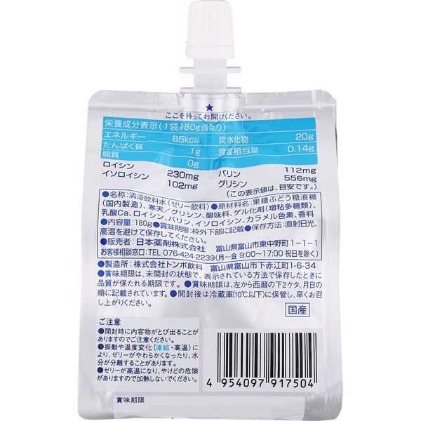 原材料 果糖ぶどう糖液糖(国内製造)、寒天/グリシン、酸味料、ゲル化剤(増粘多糖類)、乳酸Ca、ロイシン、バリン、イソロイシン、カラメル色素、香料 栄養成分表示 1袋180g当たり エネルギー・・・85kcal たんぱく質・・・1g 脂質・・・0g 炭水化物・・・20g 食塩相当量・・・0.14g ロイシン・・・230mg イソロイシン・・・102mg バリン・・・112mg グリシン・・・556mg (この表示値は、目安です。) メーカー 日本薬剤株式会社美味しくアミノ酸補給 ●アミノ酸1000mg配合 ●運動時や美容の栄養補給 ●すっきりリンゴ味