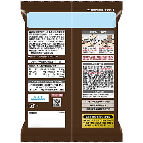 お店TOP>健康食品>栄養・美容系飲料>ゼリー飲料>ゼリー飲料全部>ぷるんと蒟蒻ゼリー プレミアムカフェ コーヒー味 (10個入×12セット(1個20g))【ぷるんと蒟蒻ゼリー プレミアムカフェ コーヒー味の商品詳細】●コーヒーの美味しさと香りをそのままゼリーにしたプチサイズの蒟蒻デザートです。●フルーツタイプの製品と比較して、柔らかい食感で作っていますので、素材の味わいがより感じやすくなっています。【召し上がり方】・両手でしっかり持ち、点線に沿ってゆっくりとお切りください。・吸い込まずに数回に分けて押し出して良く噛んでお召し上がりください。・開封口をくわえると口を切ることがありますので、押し出したゼリーだけを口に入れてお召し上がりください。【品名・名称】生菓子(ゼリー)【ぷるんと蒟蒻ゼリー プレミアムカフェ コーヒー味の原材料】果糖ぶどう糖液(国内製造)、砂糖、コーヒーエキス、蒟蒻粉、食塩/加工デンプン、ゲル化剤(増粘多糖類)、香料、塩化カリウム、甘味料(アセスルファムK、スクラロース)、リン酸カリウム【栄養成分】1個(20g)当たり熱量:10kcal、たん白質:0g、脂質:0g、炭水化物:2.42g、食塩相当量:0〜0.1g、リン:0〜5mg、カリウム:26mg【保存方法】直射日光、高温多湿をさけ、涼しい所で保存して下さい。【原産国】日本【発売元、製造元、輸入元又は販売元】オリヒロプランデュ※説明文は単品の内容です。リニューアルに伴い、パッケージ・内容等予告なく変更する場合がございます。予めご了承ください。・単品JAN:4571157252957オリヒロプランデュ370-0886 群馬県高崎市下大島町6130120-534-455広告文責:楽天グループ株式会社電話:050-5577-5042[ダイエット食品]