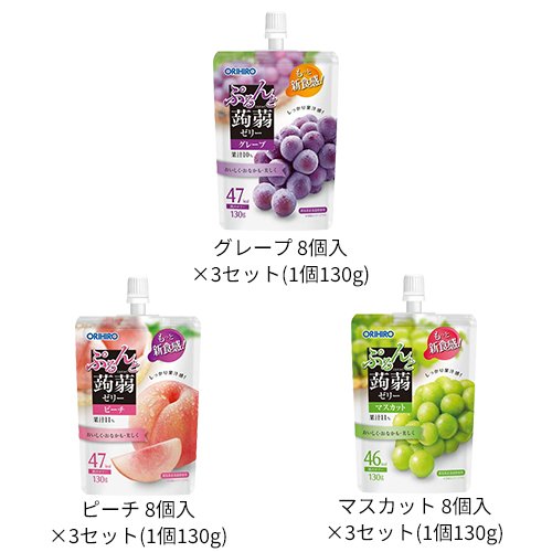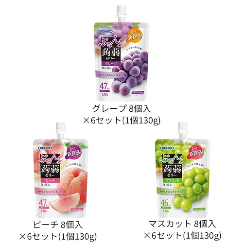 お店TOP>健康食品>栄養・美容系飲料>ゼリー飲料>ゼリー飲料(ダイエット)>ぷるんと蒟蒻ゼリー スタンディング (3セットor6セット)【ぷるんと蒟蒻ゼリー スタンディングの商品詳細】●美味しくてヘルシー●群馬県産蒟蒻粉使用【品名・名称】生菓子(フルーツゼリー)【ぷるんと蒟蒻ゼリー スタンディングの原材料】グレープ:果糖ぶどう糖液糖(国内製造)、果汁(ブドウ、リンゴ)、還元水飴、砂糖、蒟蒻粉/酸味料、ゲル化剤(増粘多糖類)、香料、塩化カリウム、甘味料(アセスルファムK、スクラロース)ピーチ:果糖ぶどう糖液糖(国内製造)、ピーチ果汁、還元水飴、砂糖、蒟蒻粉/酸味料、ゲル化剤(増粘多糖類)、香料、塩化カリウム、甘味料(アセスルファムK、スクラロース)マスカット:果糖ぶどう糖液糖(国内製造)、果汁(マスカット、リンゴ)、砂糖、蒟蒻粉、還元水飴/酸味料、ゲル化剤(増粘多糖類)、香料、塩化カリウム、甘味料(アセスルファムK、スクラロース)【栄養成分】グレープ:製品130g中熱量:47kcal、たんぱく質:0g、脂質:0g、炭水化物:11.7g、食塩相当量:0〜0.5gピーチ:製品130g中熱量:47kcal、たんぱく質:0g、脂質:0g、炭水化物:11.6g、食塩相当量:0〜0.5gマスカット:り製品130g中熱量:46kcal、たんぱく質:0g、脂質:0g、炭水化物:11.5g、食塩相当量:0〜0.6g【アレルギー物質】グレープ:りんごピーチ:ももマスカット:りんご【保存方法】直射日光、高温多湿を避け、涼しい所で保存してください。【注意事項】・開封後は、キャップとリングが1カ所を残して離れる形になります。・開封後はすぐにお召し上がりください。・加熱・冷凍はおやめください。・体質に合わない場合はご利用を中止してください。・冷やすとよりいっそう美味しく召し上がれます。・のどに詰まらせないよう、中身を押し出しながらよくかんでお召し上がりください。・食生活は、主食、主菜、副菜を基本に、食事のバランスを。【原産国】日本【発売元、製造元、輸入元又は販売元】オリヒロプランデュリニューアルに伴い、パッケージ・内容等予告なく変更する場合がございます。予めご了承ください。オリヒロプランデュ370-0886 群馬県高崎市下大島町6130120-534-455広告文責:楽天グループ株式会社電話:050-5577-5042[ダイエット食品]