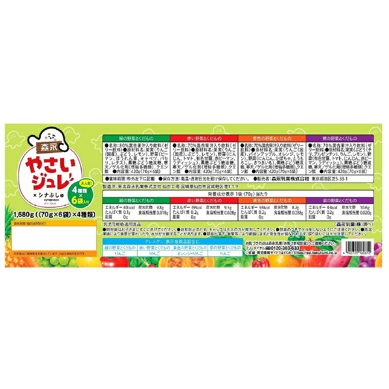 8種類の野菜と果物を使用1歳ごろからチュウチュウ飲めるお子様向けゼリー飲料お出かけ先でも車の中でも飲みやすいパウチ容器4種が6個ずつ入ったアソートパック【アソート内容】・緑の野菜とくだもの(りんご・ぶどう・レモン・ピーマン・ほうれん草・キャベツ・パセリ・レタス)×6個 ※アレルゲン(27品目中):りんご・赤い野菜とくだもの(りんご・ぶどう・レモン・にんじん・トマト・有色甘藷・赤ピーマン・ラディッシュ)×6個 ※アレルゲン(27品目中):りんご・黄色の野菜とくだもの(りんご・パインアップル・オレンジ・レモン・にんじん・かぼちゃ・とうもろこし・さつまいも)×6個 ※アレルゲン(27品目中):オレンジ・りんご・紫の野菜とくだもの(ぶどう・りんご・レモン・有色甘藷・トマト・にんじん・赤ピーマン・ラディッシュ)×6個 ※アレルゲン(27品目中):りんご?【内容量】70g×24個入り?【商品特徴】・8種類の野菜と果物でギュッとおいしく仕上げました! 果汁+野菜汁=100%!・手に持って食べやすいストロー付きパウチ容器なので、お子さまの「自分で飲みたい! 」を応援します。・誤飲防止に配慮した大きなキャップを採用しました。・着色料・香料・保存料・人工甘味料不使用! 素材を生かした自然な味わいに仕上げました。おやつにもピッタリ!・冷やしても、凍らせてもおいしい! お出かけ先や、車の中でも、こぼさずお飲みいただけます!・対象年齢:1歳頃からずっと