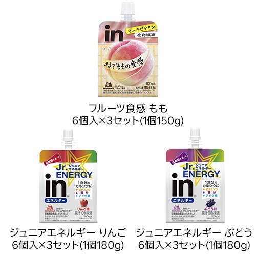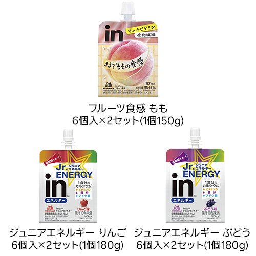 お店TOP>健康食品>栄養・美容系飲料>ゼリー飲料>ゼリー飲料全部>森永製菓 inゼリー (6個入)商品区分:栄養機能食品(栄養成分:★フルーツ食感もも:ビオチン★ジュニアエネルギー りんご・ぶどう:カルシウム)【森永製菓 inゼリーの商品詳細】●「inゼリー」シリーズはおいしく素早く目的のエネルギーや栄養素・水分を補給できる、飲むゼリータイプの栄養補助食品です。2025年8月1日 592850 592851 592852 592853 削除、607324 607325 607326 607327 追加【栄養成分(栄養機能食品)】★フルーツ食感もも:ビオチン★ジュニアエネルギー りんご・ぶどう:カルシウム【保健機能食品表示】★フルーツ食感ももビオチンは、皮膚や粘膜の健康維持を助ける栄養素です。★ジュニアエネルギー りんご・ぶどうカルシウムは、骨や歯の形成に必要な栄養素です。【基準値に占める割合】★フルーツ食感もも:ビオチン:42%★ジュニアエネルギー りんご・ぶどう:カルシウム:36%【1日あたりの摂取目安量】1袋【召し上がり方】1日当たり1袋を目安にお召し上がりください。【品名・名称】★フルーツ食感もも:生菓子(ゼリー)★ジュニアエネルギー りんご・ぶどう:清涼飲料水(ゼリー飲料)【森永製菓 inゼリーの原材料】★フルーツ食感もも:砂糖(国内製造)、もも果汁、難消化性デキストリン、果糖ぶどう糖液糖、発酵乳(殺菌)、寒天/ゲル化剤(増粘多糖類)、香料、乳酸Ca、酸味料、V.C、甘味料(アセスルファムK、スクラロース)、ナイアシン、パントテン酸Ca、乳化剤、V.E、V.B1、V.B2、V.A、V.B6、葉酸、ビオチン、V.D、V.B12★ジュニアエネルギー りんご:砂糖(国内製造)、ぶどう糖、りんご果汁、水あめ、寒天、ドライトマトエキス/乳酸Ca、香料、酸味料、ゲル化剤(増粘多糖類)、塩化K、乳化剤、ピロリン酸鉄、V.D★ジュニアエネルギー ぶどう:砂糖(国内製造)、ぶどう糖、ぶどう果汁、水あめ、寒天、ドライトマトエキス/乳酸Ca、香料、酸味料、ゲル化剤(増粘多糖類)、塩化K、乳化剤、ピロリン酸鉄、V.D【栄養成分】★フルーツ食感 もも:1袋分(150g)当たりエネルギー:87kcal、たんぱく質:0g、脂質:0g、炭水化物:26.0g(糖質:20.4g、食物繊維:5.6g)、食塩相当量:0.07g、ナイアシン:4.4〜11.7mg、パントテン酸:1.6〜9.5mg、ビオチン:21μg、ビタミンA:257〜629μg、ビタミンB1:0.4〜1.3mg、ビタミンB2:0.5〜1.2mg、ビタミンB6:0.5mg、ビタミンB12:0.8〜2.8μg、ビタミンC:34〜90mg、ビタミンD:1.9〜7.6μg、ビタミンE:2.2mg、ビタミンK:0μg、葉酸:80〜362μg★ジュニアエネルギー りんご:1袋(180g)当たりエネルギー:160kcal、たんぱく質:0g、脂質:0g、炭水化物:40.0g、食塩相当量:0.03g、カルシウム:250mg、鉄:1.9mg、ビタミンD:1.5〜9.9μgブドウ糖10.0〜18.7g★ジュニアエネルギー ぶどう:1袋(180g)当たりエネルギー:160kcal、たんぱく質:0g、脂質:0g、炭水化物:40.0g、食塩相当量:0.04g、カルシウム:250mg、鉄:1.9mg、ビタミンD:1.5〜9.9μgブドウ糖:10.0〜18.7g【アレルギー物質】★フルーツ食感もも:乳・もも★ジュニアエネルギー りんご:りんご【保存方法】直射日光・高温を避けて保存してください。【注意事項】★フルーツ食感もも・ビタミンAを含みますので妊娠3か月以内又は妊娠を希望する女性は過剰摂取にならないように注意してください。★共通・開封後はすぐにお召し上がりください。・水分が分離したり色調が変わることがありますが、品質には問題ありません。・容器への強い衝撃はお避けください。容器が破損することがあります。・容器は自治体の区分に従って処分してください。・冷やすといっそうおいしくなります。・この製品はプラスチックキャップで密封包装しています。・しっかり食感のため口に付けぎゅっと押しながらお召し上がりください・小児は本品の摂取を避けてください。・凍結させたものを解凍すると、風味・食感が変わることがあります。・本品は、多量摂取により疾病が治癒したり、より健康が増進するものではありません。一日の摂取目安量を守ってください。・本品は、特定保健用食品と異なり、消費者庁長官による個別審査を受けたものではありません。・食生活は、主食、主菜、副菜を基本に、食事のバランスを。【原産国】日本【発売元、製造元、輸入元又は販売元】森永製菓商品に関するお電話でのお問合せは、下記までお願いいたします。化粧品以外(食品、飲料等):0120-560-162(月曜日〜金曜日(祝日を除く) 午前10時〜午後4時)化粧品:0120-80-5580(9時〜19時、土・日・祝日も問合せ可)リニューアルに伴い、パッケージ・内容等予告なく変更する場合がございます。予めご了承ください。森永製菓108-8403 東京都港区芝5-33-1 ※お問合せ番号は商品詳細参照広告文責:楽天グループ株式会社電話:050-5577-5042[ダイエット食品]