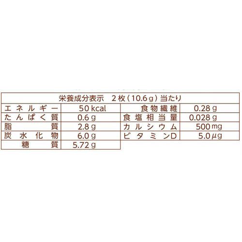 お店TOP>健康食品>栄養機能食品>栄養機能食品全部>骨にカルシウムウエハース (18枚入×20セット)商品区分:栄養機能食品(栄養成分:カルシウム)【骨にカルシウムウエハースの商品詳細】●カルシウムが手軽に摂れるバニラ風味のウエハースです。●2枚あたり500mgのカルシウムと、ビタミンD配合。【栄養成分(栄養機能食品)】カルシウム【保健機能食品表示】カルシウムは、骨や歯の形成に必要な栄養素です。【基準値に占める割合】カルシウム73%※18歳以上、基準熱量2200kcalに占める割合【1日あたりの摂取目安量】2枚【召し上がり方】1日当たり2枚を目安にお召し上がりください。【品名・名称】ウエハース(焼菓子)【骨にカルシウムウエハースの原材料】小麦粉(国内製造)、植物油脂、ブドウ糖、砂糖、乳糖、脱脂粉乳、食塩、澱粉/卵殻Ca、乳化剤(大豆由来)、膨張剤、香料、V.D【栄養成分】2枚(10.6g)当たりエネルギー:50kcal、たんぱく質:0.6g、脂質:2.8g、炭水化物:6.0g、糖質:5.72g、食物繊維:0.28g、食塩相当量:0.028g、カルシウム:500mg、ビタミンD:5.0μg【アレルギー物質】小麦、卵、乳、大豆【保存方法】直射日光、高温多湿を避けて保存してください。【注意事項】・本品は、多量摂取により疾病が治癒したり、より健康が増進するものではありません。・一日の摂取目安量を守ってください。・食生活は、主食、主菜、副菜を基本に、食事のバランスを。・本品は特定保健用食品とは異なり、消費者庁長官により個別審査を受けたものではありません。【原産国】日本【発売元、製造元、輸入元又は販売元】ハマダコンフェクト※説明文は単品の内容です。リニューアルに伴い、パッケージ・内容等予告なく変更する場合がございます。予めご了承ください。・単品JAN:4902621005609ハマダコンフェクト675-0023 兵庫県加古川市尾上町池田850-68079-457-3334広告文責:楽天グループ株式会社電話:050-5577-5042[ダイエット食品]