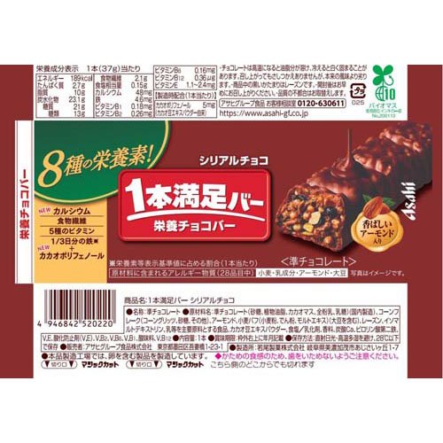 お店TOP>健康食品>ダイエットサポート>バランス栄養食>バランス栄養食品・栄養調整食品>1本満足バー シリアルチョコ (9本×3セット)【1本満足バー シリアルチョコの商品詳細】●「カルシウム」「鉄1/3日分」「食物繊維」「5種のビタミン(B1、B2、B6、B12、E)」を1本で美味しく摂取することができます。●マイルドな味わいのミルクチョコで、ザクっと食感のシリアルをコーティング。【召し上がり方】開封後はお早めにお召し上がりください。【品名・名称】準チョコレート【1本満足バー シリアルチョコの原材料】準チョコレート(砂糖、植物油脂、カカオマス、全粉乳、乳糖)(国内製造)、コーンフレーク(コーングリッツ、砂糖、その他)、アーモンド、小麦パフ(小麦粉、でん粉、モルトエキス)(大豆を含む)、レーズン、イソマルトデキストリン、乳等を主要原料とする食品、カカオ豆エキスパウダー、食塩/乳化剤、香料、炭酸Ca、ピロリン酸第二鉄、V.E、酸化防止剤(V.E)、V.B2、V.B6、V.B1、酸味料、V.B12【栄養成分】1本(37g)当たりエネルギー:189kcal、たんぱく質:2.7g、脂質:10g、炭水化物:23.1g(糖質:21g(糖類:13g)、食物繊維:2.1g)、食塩相当量:0.15g、カルシウム:48mg、鉄:4.6mg、ビタミンB1:0.18mg、ビタミンB2:0.26mg、ビタミンB6:0.16mg、ビタミンB12:0.36μg、ビタミンE:1.1〜2.4mg(製造時配合(1本当たり))カカオポリフェノール(カカオ豆エキスパウダー由来):5mg【アレルギー物質】小麦・乳成分・アーモンド・大豆【保存方法】直射日光・高温多湿を避け、28度以下で保存【注意事項】・チョコレートは高温になると油脂分が溶け、冷えると白く固まることがあります。召し上がってもさしつかえありませんが、本来の風味より劣ります。・商品中の黒いかたまりはレーズンです。・開封後はお早めにお召し上がりください。・品質の不都合はお取替えします。・本品製造工場では、卵を含む製品を製造しています。・かための食感のため、歯をいためないようご注意ください。【原産国】日本【ブランド】1本満足バー【発売元、製造元、輸入元又は販売元】アサヒグループ食品※説明文は単品の内容です。商品に関するお電話でのお問合せは、下記までお願いいたします。菓子、食品、健康食品、サプリメント、スキンケアなど:0120-630611ミルク、ベビーフード、乳幼児用品専用:0120-889283リニューアルに伴い、パッケージ・内容等予告なく変更する場合がございます。予めご了承ください。・単品JAN:4946842540549アサヒグループ食品130-8602 東京都墨田区吾妻橋1-23-1 アサヒグループ本社ビル ※お問合せ番号は商品詳細参照広告文責:楽天グループ株式会社電話:050-5577-5042[ダイエット食品/ブランド:1本満足バー/]