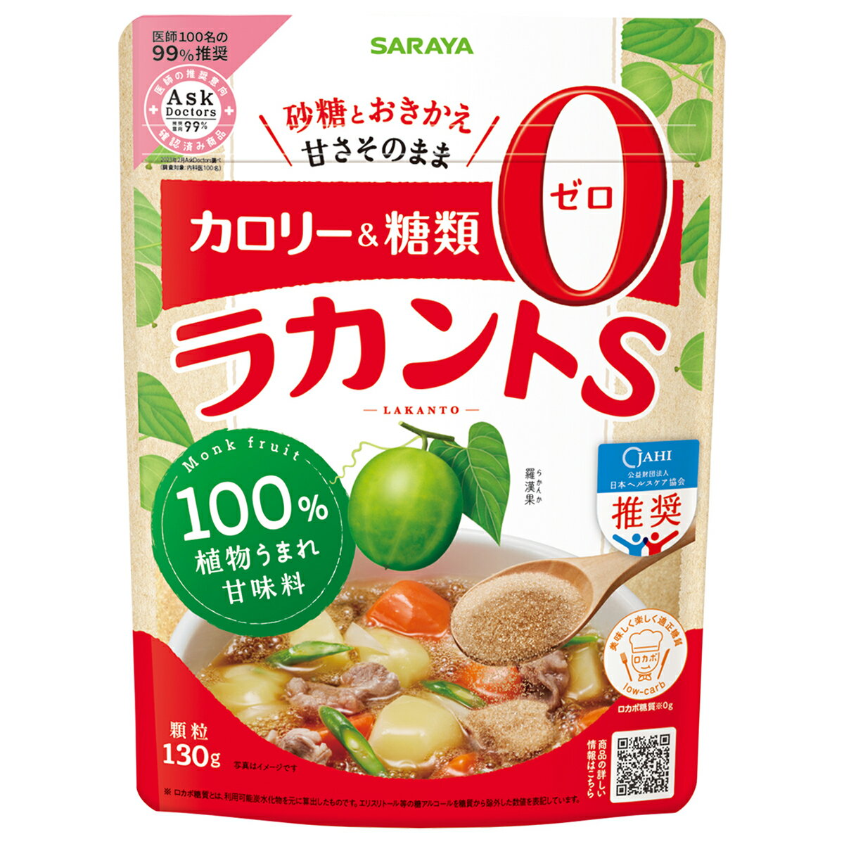 検索用キーワード: 糖質 低糖質 糖質カット 糖質コントロール 糖質制限 糖質ゼロ 糖質0 食品 おやつ お菓子 スイーツ 調味料 低糖質スイーツ 低糖質お菓子 低糖質材料 低糖質調味料 カロリーオフ カロリーカット 低カロリー カロリーコントロール トレーニング 健康ラカントS 顆粒 カロリー&糖類ゼロ、砂糖と同じ甘さの100%植物由来甘味料 ほんのりナチュラルブラウン色。黒砂糖にも似たお味で、加熱しても甘味は変わりません。 いろんな用途に大活躍する顆粒タイプです。 カロリーゼロ&糖類ゼロ!おいしく、楽しく糖質コントロール 羅漢果の生果実からわずか1%ほどしか取れない砂糖の約300倍もの甘さをもつ高純度ラカンカエキス(ラカンカ抽出物)を、とうもろこし由来の「エリスリトール」と合わせた、カロリーゼロ・糖類ゼロの甘味料です。 高純度ラカンカエキスは、1kgの羅漢果から10gしか抽出できない希少な成分。 「ラカントS」顆粒100g当たり、羅漢果の果実2~3個分が含まれます。 国内の自社工場で徹底した品質管理を行っています 羅漢果は中国桂林地方原産の果実。 昼夜寒暖差が大きく、強い紫外線を浴びる厳しい環境の中、ビタミンやミネラルが豊富な大地で育った果実は強い甘味をもち、コクのある独特な風味が特徴です。 サラヤでは契約栽培した羅漢果のみを使用し、残留農薬・重金属の検査を外部機関にて行っています。 さらに、日本国内の自社工場にて、徹底した品質管理のもと製造しています。 砂糖と同じ甘さで使いやすい 「砂糖と同じ重量で使えるので、換算不要。 加熱しても甘味が変わらないため、煮る・炊く・焼くなど幅広いお料 理にお使いいただけます。 ・ぜんざい、ジャムなど「ラカントS」をたくさん使う料理で、冷えた状態で結晶が出てくることがあります。結晶は全く害はなく、再加熱すると元の状態に戻ります。気になる場合は、使用量を加減してください。(溶ける量の目安:20℃の水100ccに対して「ラカントS」50g) ・パン作りに使用した場合、パンが膨らみにくくなります。 ・本品は加熱してもカラメル化しません。 こんな人に使ってほしい! 「・甘いものを食べたいが、摂取カロリーを抑えたい。 ・健康のため毎食の糖質をコントロールしたい。 ・甘味料は、植物由来にこだわりたい。 使い分けで料理の幅を広げよう! 温かいお料理やスイーツには顆粒タイプ、冷たいお料理やドリンクにはシロップタイプがおすすめ。 ラカントSを使ったレシピ ※類似品にご注意ください!※ 栄養成分表示 大さじ1杯(13g当たり) ※本品は体内で利用される糖質はほとんど含まれず、糖質の大部分が体外に排出されます。 商品詳細 【品名】低カロリー甘味料 【原材料名】エリスリトール(中国製造)、ラカンカエキス/甘味料(ラカンカ抽出物) 【賞味期限】パッケージ裏面に記載 【保存方法】直射日光、高温多湿をさけ、常温で保存してください。 【内容量・サイズ】 130g:幅 130mm × 奥行き 60mm × 高さ 173mm 1.1kg: 幅200mm × 奥行き49mm × 高さ284mm 【使用上の注意】 ・ラカントSの色は原材料の色によるものです。本品は植物由来原料を使用しているため、色調が異なったり羅漢果による黒い粒が混在することがありますが、品質には問題ありません。 ・本品を一度に多量にとると、体質によりお腹がゆるくなることがあります。その場合は、召し上がる量を減らしてください。 ・治療のため食事制限をされている方は、あらかじめ医師、管理栄養士等にご相談のうえ、使用されることをおすすめします。