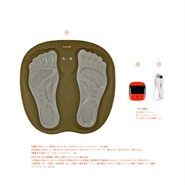 ジェル不要&USB充電式で、どこでも手軽に使えるフットマット型EMS歩行に必要な筋肉にEMS(筋電気刺激)でアプローチ。座ったまま足を乗せるだけ。足裏にフィットする3D構造です。19段階の強さレベルと6種類のモードで、気分や用途に合わせた快適なフットケアを実現。軽量コンパクト設計で、持ち運びもラクラク。30分オートパワーオフ機能付きで、使い過ぎや切り忘れを防止します。【商品仕様】サイズ:(約)縦32cm 横32.5cm 高さ10cm商品重量:(約)本体:110g コントローラー:25g動作電圧・電流:電圧3.7V 電流180mA使用電源:充電式リチウムイオン電池充電時間:1〜2時間持続時間:3〜6時間カラー:サンドカーキ×オレンジセット内容:本体パッド、コントローラー、USBケーブル(充電用)材質:本体パッド:導電布、ポリウレタン、クロロプレンゴム、コントローラー:ABS 樹脂