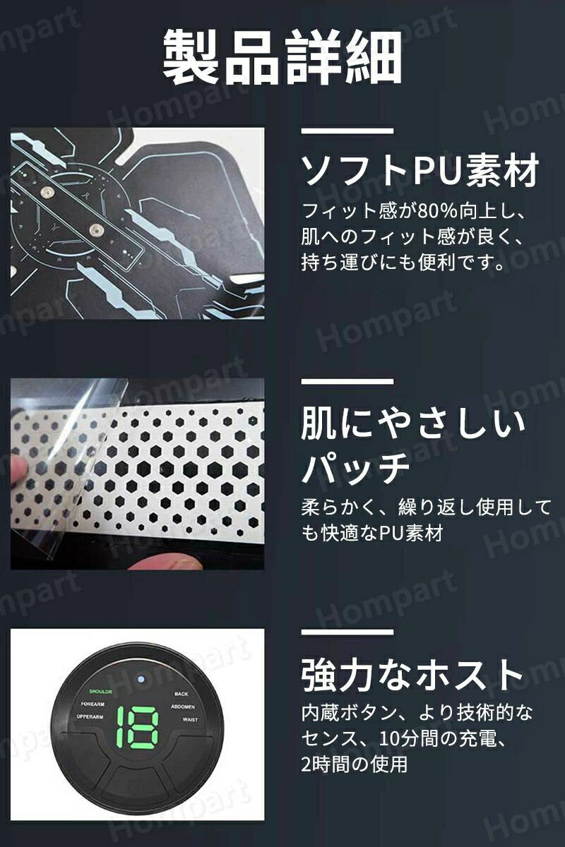 製品パラメータ 製品名:EMSスマート腹筋パッチ 電圧:5V 電池容量:150MA 原産国:中国製品パラメータ 製品名:EMSスマート腹筋パッチ 電圧:5V 電池容量:150MA 原産国:中国