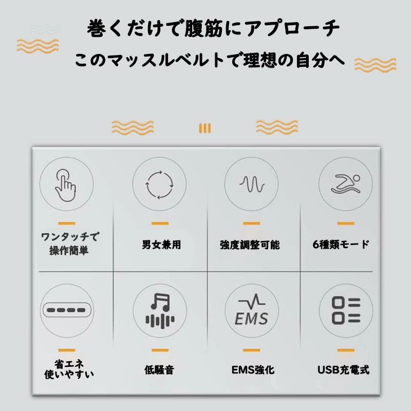 商品情報ベルト型EMS安定感抜群&集中的に鍛えるパッド型と違ってしっかりベルトとして巻いて固定できるため、安定感抜群で腹筋を鍛えられるems 腹筋ベルト。日常生活だけでなく運動中にも装着してより効果的な腹筋トレーニングを実現させます。ジェルシート不要とUSB充電式でコストダウン消耗ジェルシート交換も不要で、導電パッドを水で拭いてから使えます。従来のEMS 腹筋ベルトと比べて洗浄しやすく、使い回しが経済的でとてもお得です。コードレスで使用できるという便利なEMSマシンで、非常に軽く、電池交換不要の充電式を採用されます。6モード・9強度を自由選択筋トレをよりよく実現するため、6つのモードの振動数が再設定され、モード毎に9つの強度レベルがあります。過度使用と使用中に寝たなどのことを防ぐために、毎回の使用には、20分間後自動に電源オフにします。又電源をONにして10秒以内操作がない場合、もしくは皮膚と外れる10秒以上の場合、自動的に電源オフになります。ご注意※本製品は診断や治療に用いる医療機器ではなく、一般家庭用の運動補助器です。EMS腹筋ベルト 腹筋トレーニング 腹筋器具 フィットネスマシン EMS 腹筋ベルト ジェル不要 効果 強力モード 筋トレ デジタル表示 USB充電式 6種類モード 9段階強度調整可能 ダイエット器具 ギフト プレゼント 男女兼用 EMS腹筋ベルト 腹筋トレーニング 腹筋器具 フィットネスマシン EMS 腹筋ベルト ジェル不要 効果 強力モード 筋トレ デジタル表示 USB充電式 6種類モード 9段階強度調整可能 男女兼用 5