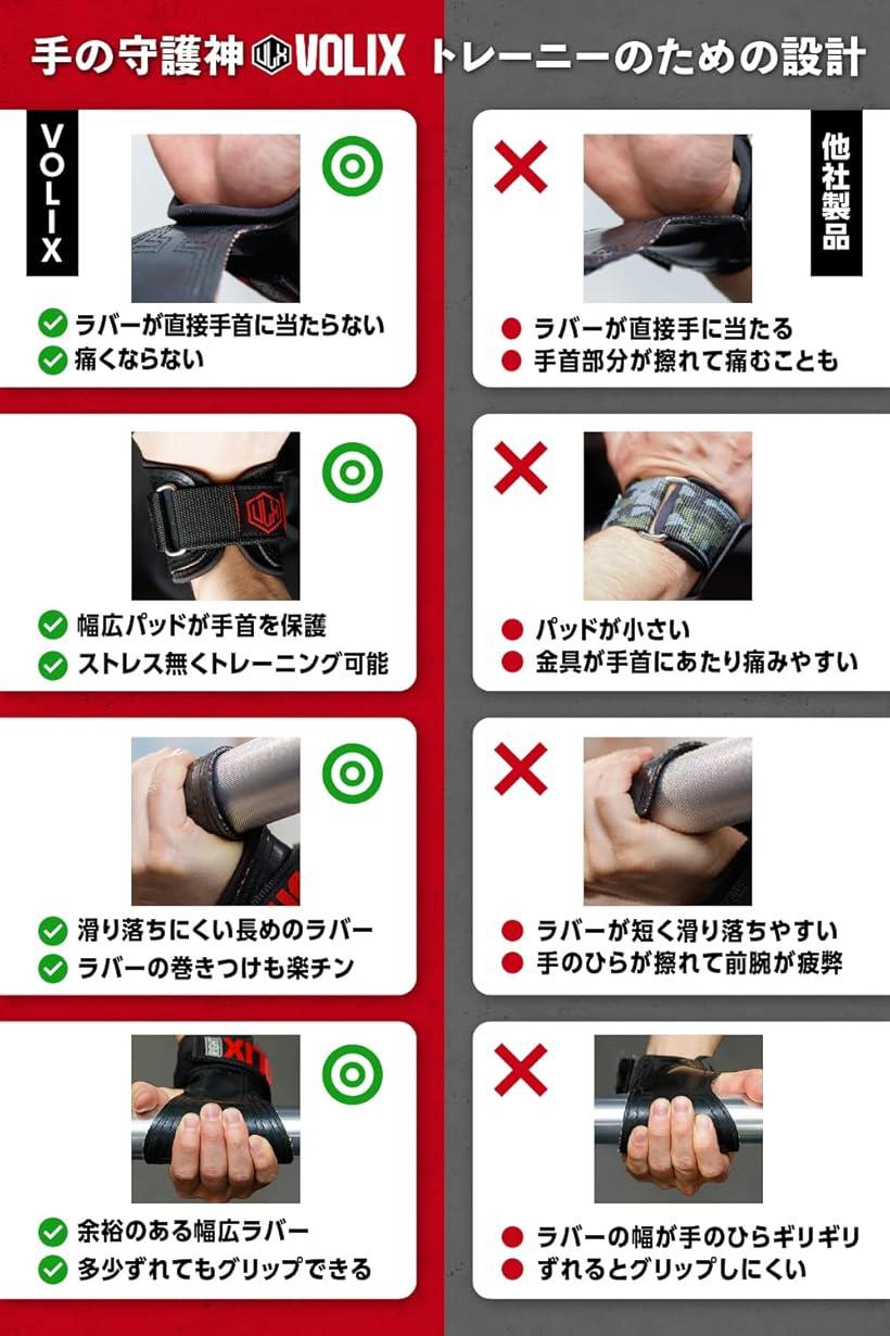 「トレーニーがこだわり抜いて作ったパワーグリップ」開発スタッフがトレーニーで、実際のトレーニングで使用し試行錯誤を重ね完成しました。握力が尽きても離れないホールド力と安定感、手首を守る鉄壁の設計で限界を超えたトレーニングが可能に。「幅広形状で わずかな握力でもホールド持続」幅広&長めのラバーでシャフトを包み込むのでズレにくい。シャフトへの巻き付けも片手で楽チン。握力補助に。「手のひらや手首が痛くならない 三層構造設計」金具が食い込まないよう設計されているので、手首が痛くならずトレーニングに集中できる。「日本国内の引張試験合格済み」VOLIXノンスリップラバーは滑らないだけでなく、両手合計引張強度”762kg”で千切れる心配なく安心安全にお使いいただけます。※ 他ネットショップでも併売しているため、ご注文後に在庫切れとなる場合があります。予めご了承ください。※ 品薄または希少等の理由により、参考価格よりも高い価格で販売されている場合があります。ご注文の際には必ず販売価格をご確認ください。※ 沖縄県、離島または一部地域の場合、別途送料の負担をお願いする場合があります。予めご了承ください。※ お使いのモニタにより写真の色が実際の商品の色と異なる場合や、イメージに差異が生じることがあります。予めご了承ください。※ 商品の詳細(カラー・数量・サイズ 等)については、ページ内の商品説明をご確認のうえ、ご注文ください。※ モバイル版・スマホ版ページでは、お使いの端末によっては一部の情報が表示されないことがあります。すべての記載情報をご確認するには、PC版ページをご覧ください。