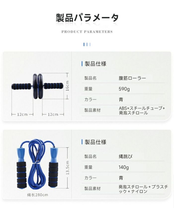 7in1 トレーニングセット 筋トレに最適な7点セットです。 【用途】腹筋(腹直筋、腹斜筋)、大胸筋、三角筋、上腕三頭筋などのトレーニング ダブルホイール仕様でぐらつきを軽減。安定した正確なフォームで運動が可能です。 ダイエットにおすすめの腹筋トレーニング用器具です。 膝立ちで転がすだけでも十分に効果を得られます。 付属のEVA素材の膝当てクッションで膝が痛くならないようトレーニングをサポート! 【用途】プッシュアップ(腕立て伏せ) 通常の腕立て伏せよりも可動範囲が広がり、負荷がかかるので効果もアップします。 また、女性の方はバストアップと二の腕の引き締めにも効果があります。 初心者の方にもオススメです。 しっかり握ることができるグリップ構造 使用しない時は、足部分を取り外してコンパクトに収納することも可能です。 そのほかに、パワーグリップや縄跳び、エクササイズバンド、プッシュアップバーもついております! ジムに通う時間がなく、自宅をホームジムにし、宅トレをしたいトレーニーにオススメの器具です。