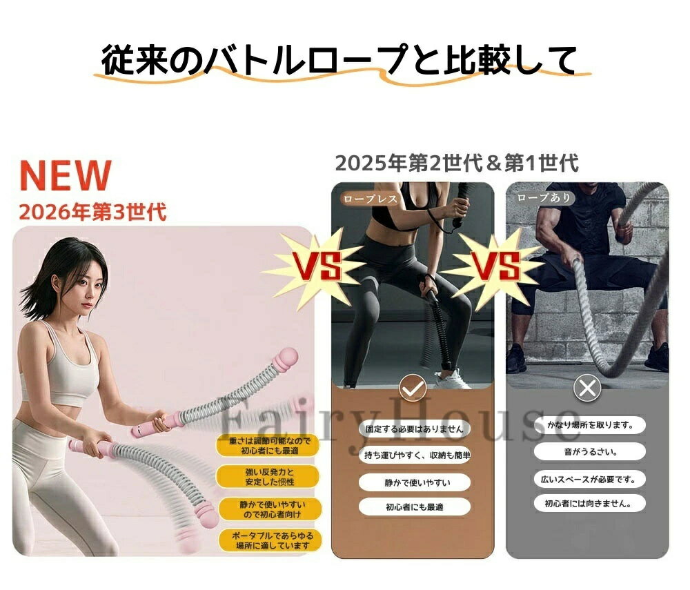 【商品番号】y751549【材質】スチールスプリング、TPR、PP、ABS【カラー】グレー/ピンク/パープル/ブラック【製品サイズ】全長約43cm【重量(2点)】約1.3kg【適用部位】腕、腹部、胸筋など全身の総合トレーニング/対象ユーザー:男女兼用※高品質のスチールスプリングが強力な反発力を提供内蔵の高強度スチールスプリングが、ロープの力強い波のような動きをリアルに再現します。高い弾力性と強力な反発力により、腕、肩、背中、体幹、脚を刺激します。さらに、外層は耐久性の高いシリコンで保護されているため、長期間使用しても変形しにくく、優れた耐久性を実現しています。静音設計で省スペース、ご家庭での使用に最適コードレス設計で省スペース、床や壁を傷つけることなく静かに作動します。長さ約43cm、重さ約1.3kgとコンパクトで持ち運びやすく、限られたスペースでも高強度のバトルロープトレーニングが可能です。マンション、オフィス、ホテルなど、周囲の迷惑にならず安全にご使用いただけます。握りやすく安全なTPRグリップとリストストラップ滑りにくいTPRグリップは快適で、長時間使用しても手に負担がかかりません。リストストラップがしっかりとホールドし、より自信を持ってスイングできます。初心者から上級者まで、快適で安全にお使いいただけます。全身くまなく鍛えられるオールインワントレーニング設置不要で、いつでもどこでもすぐにトレーニングを始められます。筋力強化、脂肪燃焼、体幹強化、持久力向上など、あらゆるフィットネスニーズに対応します。この次世代フィットネスロープは、性別を問わず、ご家族全員でお楽しみいただけます。収納簡単:収納バッグが付属しています。付属の収納バッグでコンパクトにまとまり、持ち運びや保管も簡単です。