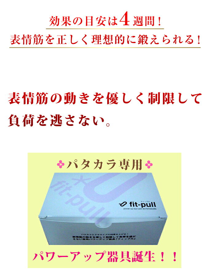 SSspecial03mar13_beauty ギフト対応 ※ご注文前に お支払い・送料・配送について必ずご確認ください。 ★ 美容上級者のために・・・『ヴィーナスセット』が新発売!! ★ すでにフィップルをお持ちの方へ『パタカラプレミアム単品』もご用意しております!! ご購入者のレビュー(感想)はこちらからご覧いただけます。 パタカラを引っ張るエクササイズを最小限の力で効果的にサポートします。 表情筋には関節がないため、しっかりトレーニングするためには 負荷を逃さないようにするのがポイントです。 どんなに大変なエクササイズでも、負荷がかからないエクササイズでは効果が出ません。 フィップルを使用することで誰でも簡単に、パタカラによる表情筋トレーニングの 効果を高めることができます。 ▼注意▼ 商品の性質上、開封後の返品はお受けできません。 万が一、製品がお肌に合わない場合は、ご使用をおやめください。 使用期間の目安は約1年です。 モニターの発色の具合によって実際のものと色が異なる場合があります。 商品名 フィップル(fit-pull) カラー ピンク 内容 本体・ケース・取扱説明書 サイズ 58×50×60(mm) 材質(本体) スチレン系エラストマー 開発・製造 株式会社FFC 区分 日本製・美容器具 広告文責 株式会社パタカラ 0422-29-8192 【パタカラはギフトにもぴったりです!】 妻 彼女 女友達 嫁 女の子 女性 姉 おすすめ ママ 母 父 祖母 祖父 ラッピング バースデー 誕生日 プレゼント ギフト 贈り物 バレンタインデー ホワイトデー 母の日 ブライダル クリスマス お正月 敬老の日ご注文ありがとうございます
