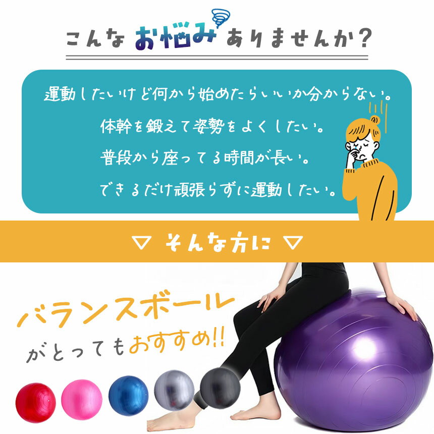 お家で手軽にエクササイズ!座るだけでも効果あり◎バランスボールこんなお悩みありませんか!・運動したいけど何から始めたらいいかわからない・体幹を鍛えて姿勢をよくしたい・普段から座っている時間が長い・できるだけ頑張らずに運動したいなどなど軽く運動したい方もしっかり運動したい方にも、バランスボールがおすすめです!【バランスボールのメリット】座るだけで体幹を鍛えられる柔軟性やバランス能力のUP!筋力の増加 【カラー】ブラック/グレー/パープル/ブルー/レッド/ピンク【素材】PVC【サイズ】直径:55cm重量(本体のみ):約600g※日本語取扱説明書、撮影用小物類などは付属しておりません。※簡易包装でのお届けとなります。※モニターにより色合いが若干違いが生じる場合がございます。※デザインは入荷時期により若干変化する場合がございます※海外製造品のため、多少の匂い軽微な傷や汚れ、個体差等ある場合がございます。※商品の使用により生じた如何なる損害・被害も弊社では一切の責任を負いかねますので予めご了承ください。※発送方法について:お届け先、個数によって配送情報に記載の配送業者とは異なる場合がございます。日本郵便、佐川急便、またはセイノーエクスプレス(大型商品)でお届けいたします。なお、配送業者はお選びいただけませんので、ご了承ください。