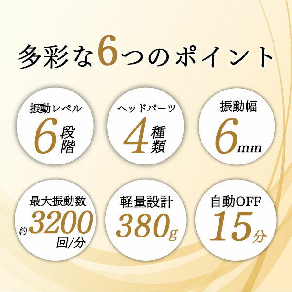 ころんとした可愛らしい見た目とは対照的に、 心地よい振動で筋肉にアプローチする、ボディケアにぴったりのエクササイズガンです。 軽量&コンパクト設計で手にフィットしやすく、使いやすさも抜群。 4種類のアタッチメント付きで、腕・鎖骨・太もも・お腹・お尻・脚など、 さまざまな部位にアプローチできます。 ●6段階の振動レベル切替 ●1分間に最大3200回の振動力 ●6mmの振動幅でしっかり刺激 ●4つのアタッチメント ●片手でラクラク軽量&コンパクト ●15分タイマーで自動OFF ●押し込むと強く振動圧力センサー搭載 サイズ(約) H13×W11cm 重量(約) 380g(パーツ込み) 充電時間(約) 2.5〜3時間 稼働時間(約) 3〜4時間 ※15分で自動電源OFF ※使用状況により変化します。 入力 5V/2A 出力 24W 付属品 ヘッドパーツ×4・Type-Cケーブル・説明書(日本語)