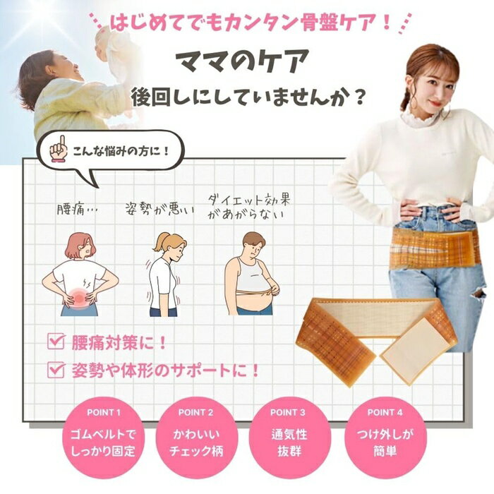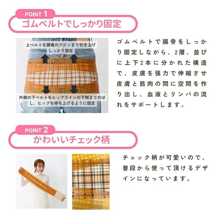 サイズ:L〜LL:ヒップ92cm〜105cm 本体サイズ:幅12cm×全長105cm 本体重量:約240g 本体ベルト素材:外側部/天然ゴム、内側部/ポリエステル・ポリウレタン 面ファスナー素材:ナイロン 生産国:日本 POINT1:ゴムベルトでしっかり固定 ゴムベルトで腸骨をしっかり固定しながら、2層、並びに上下2本に分かれた構造で、皮膚を張力で伸縮させ皮膚と筋肉の間に空間を作り出し、血液とリンパの流れをサポートします。 POINT2:かわいいチェック柄 チェック柄が可愛いので、普段から使って頂けるデザインになっています。 POINT3:通気性抜群 ゴムベルトに穴が開いているので、通気性は抜群でムレにくいです。 POINT4:つけ外しが簡単 広めの面ファスナーで装着が簡単。サイズ調節も楽にできます。 関連キーワード: 骨盤ベルト 骨盤サポーター 腰用ベルト 腰サポーター 骨盤補正ベルト 骨盤矯正ベルト 腰痛対策 腰用サポーター 腰固定ベルト コルセット 産後ベルト マタニティ後 骨盤安定 骨盤ケア用品 骨盤引締めグッズ 腰保護 サポート用品 姿勢補整 姿勢サポーター 体幹ベルト インナーサポーター 健康ベルト 健康グッズ ボディサポート 腰回りケア ウエストサポート 腰用インナー 男女兼用 レディース用 女性向け 主婦向け ママ向け 産後ケアグッズ 家事サポート 仕事用サポーター 立ち作業用 デスクワーク用 腰負担軽減 腰ラクグッズ 日常ケア 健康サポート フィットベルト 調整式ベルト 面ファスナー 着脱簡単 蒸れにくい オールシーズン 通年使用 薄型設計 インナー使用 上着に響きにくい サポートアイテム セルフケア用品