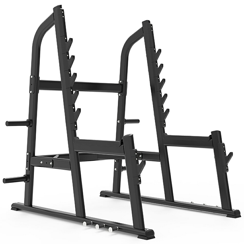 主に、バーベルを使ったトレーニングを安全かつ効果的に行うための専用マシンです。 バーベルを適切な高さに設置・保持できるため、バーベルやベンチを併用して、スクワットやベンチプレスなど様々な種目に使用できます。 トレーニング中に限界が来て持ち上げられなくなった場合でも、設定したセーフティーバー(安全バー)がバーベルを受け止めるため、怪我のリスクを減らせます。補助者がいなくても安心して高重量トレーニングに取り組める。 商品番号 SITF-8601 商品名 スクワットラック サイズ W 177.6cm X D 172.2cm X H 189.0cm 総重量 約124kg 負荷方式 プレートロード (オリンピック[Φ50]プレート専用) 耐荷重 300kg フレームカラー 黒 体重制限 150kg 必要工具 送料 無料(北海道・沖縄・離島は別途送料あり) 【※※ 注意事項 ※※】 お支払方法 1.ご注文後、1週間以内に弊社指定の銀行口座に全額お振込み下さい。振込手数料はお客様ご負担となります。 2.学校法人・官公庁は後払いが可能でございます。 3.ネットでのご注文は、クレジットカード決済も可能でございます。 4.代引き決済でのお支払いはお受けできません。 納期について 1.メーカーから通知された納期に海上輸送・通関日数を加え予定日を算出します。(納期は約60日) 2.全てが輸入品のため、海上輸送上、天候やコロナウイルスによるロックダウン等で遅延が発生する可能性がございます。  また相手国及び日本国内で長期休暇がある場合、通関に日数を要します。  遅延が発生する可能性がある場合、国内通関業者と連携し、その都度ご案内いたします。  天災を含む不可抗力による納期遅れで生じた一切の損害と全ての請求事項につきましては、当社は一切の責任は負いかねますので予めご了承ください。 梱包・組立について 1.商品は全てお客様のもとで組立てをお願い致します。工具はお客様にてご用意ください。 2.出張組立をご希望の場合は、別途見積りとなります。 3.商品により特別な梱包を必要とする場合、別途費用が発生する場合がございます。 配送について 1.大型マシンは、車上引き渡しとなり、トラックからの荷下ろし及び搬入はお客様に御手配いただきます。 2.日曜・祝日及び夜間の配送は承れませんので予めご了承ください。また時間指定も承れません。 3.チャーター便をご希望の場合は、別途送料を頂きます。 キャンセル・返品・交換について 受注生産品により、ご注文確定後のキャンセル・返品・交換はできません。 メーカーの製造遅延や天候による海上輸送の遅延が発生した場合による納品遅延も例外ではございません。 不良品やご注文品と異なる商品が納入された場合は、商品到着後7日以内にご連絡ください。 保証期間 1.機材本体の保証期間は納品日より一年とします。ただし送料はお客様ご負担となります。 2.使用による消耗、劣化、変色等及びケーブル・滑車・ピン・パッド・シート等は保証の対象外です。 3.期間終了後は有償での交換となります。ただし、製造終了したマシンの場合は、部品交換や修理ができない場合もございます。 ※初期不良および欠品、故障等があった場合、部品の在庫がありましたら2〜3日ほどでお届けいたします。在庫のない場合は取り寄せとなりますので多少お待ちいただきます。予めご了承ください。 その他 1.改良のため、予告なく形状・色・仕様が変更される場合があります。 2.ホームページ及びカタログに記載されたサイズ・重量・カラー等は、実際と多少異なることがございます。 3.組立の際に床を傷つける恐れがありますので、マット等をご使用下さい。→ ラバーマット等