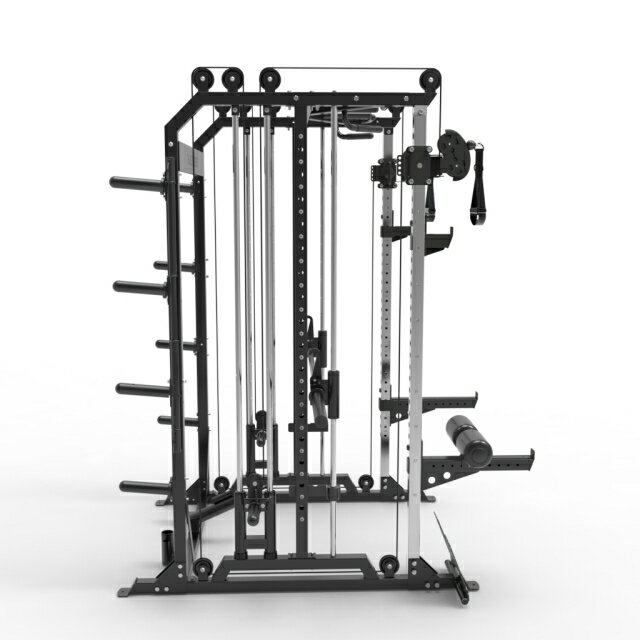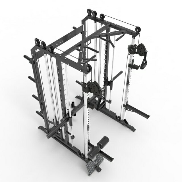 新型マルチスミスマシン X2 X1のアップグレード版 特徴 ・スミスバーのフックピンの5cm単位の任意設定(間隔は10cm以上必要) ・日本の部屋の高さ240cmに合わせたバーベルホルダー 2本 ・片側4本合計8本のプレートホルダー ・マルチグリップチンアップバー ・奥行きのない部屋でもTバーロウが可能なポジションにランドマイン設置 ・ラットプル用ニーパッド ・ビッグアームの上下移動をよりスムーズにするためにローラーを使用 ・長さ約40cmのスミスマシンウェイトホーン ・セーフティ長45cm ・レッグプレスプレート、カーフレイズ(オプション) ・寸法 幅 203cm 高さ 220cm 奥行 176cm ラック外幅118cm ラック内幅108cm ・重量 147kg X1との比較 ・スミスマシンの強度 X1<X2 ・スミスマシンのフック方法 X1ホール X2フックピン ・スミスマシンのフック間隔 X1 12.5cm X2 10cm ・スミスマシンのスタートポジション、セーフティポジション X1固定 X2任意(5cm間隔) ・スミスマシンの返しの固定 X2のみ ・レッグプレスプレート、カーフレイズ X2のみ(オプション)