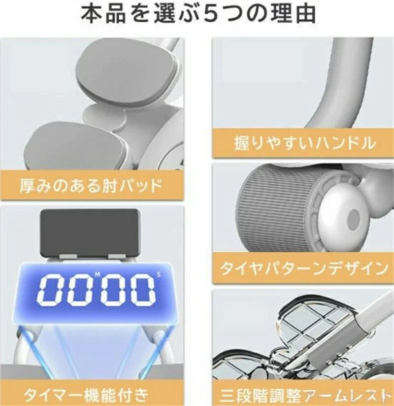 商品スペック 商品説明 【腹筋ローラー膝用マット付き・4個肘置き付き】 従来の 2輪 腹筋ローラーは肘や膝に大きな負担がかかり、腕を伸ばすと肘や肩に負担がかかります。この静か腹筋ローラーは、アームレスト(4個肘置き)と膝用マットを搭載することで、肘、腕、膝、肩で体重を支え、負担を分散。肘、膝、肩への過度な負荷を軽減。トレーニング初心者の方でも安心! 【タイマーとスマホホルダー付き】 タイマーにはワークアウト時間が表示されます。これにより、各ワークアウト ルーチンを追跡し、次のエクササイズ プランを立てることができます。さらに、当社の初心者 腹筋ローラーには携帯電話ホルダーが含まれています。エンターテイメントプログラムを視聴したり、運動中に学習ビデオを運動したりすることができます。運動はもはや退屈ではありません。 【3段階調整可能・自動リバウンド式】 室内 腹筋ローラー 3段階調整可能、肘の長さに応じて腹筋ローラーの底を調整できます。高品質のスプリングを内蔵しているため、筋肉を伸ばしながらスムーズにトレーニングができ、どこまで伸ばしても、ストレッチ限界に達すると自動的にブレーキがかかり、ケガの心配なく、楽にトレーニングをすることができます。初心者、上級者、男性、女性にも自宅に楽しみ筋トレします! 【超静音・床に傷つかない】 静音性抜群!この静か 腹筋ローラーのローラーは、6層の防音材料でできています。トレッドパターン(切り込み)でスムーズな回転かつ安心の滑りにくさと静音を実現。たとえあなたがアパートに住んでいても、隣人を邪魔することを心配する必要はありません。約10cmの幅広ホイールは高い安定性を実現。柔らかいABS樹脂素材で家の床に傷つかない。 【安定性up 3角構造】 腹筋を鍛えているときに、左右の揺れによるケガを避けるために、腹筋ローラーアシスト機能付きは安定性抜群の3角構造設計を採用しました。 【全身の筋肉にアプローチし体幹を鍛えれる】 臀筋群、ハムストリングス、前鋸筋、外腹斜筋、大胸筋、三角筋、広背筋、上腕三頭筋、腹直筋などローリング運動だけで身体の幅広い箇所を鍛えられます。 【付属品】 膝用パッド×1 タイマー×1 携帯電話ホルダー×1 【仕様】 耐荷重150kg