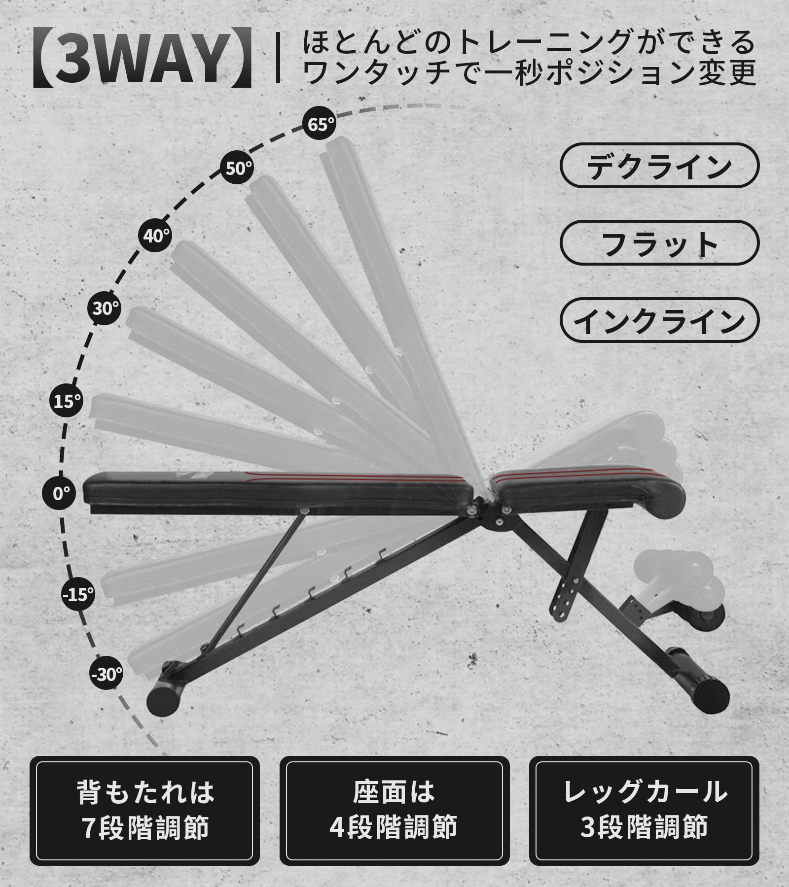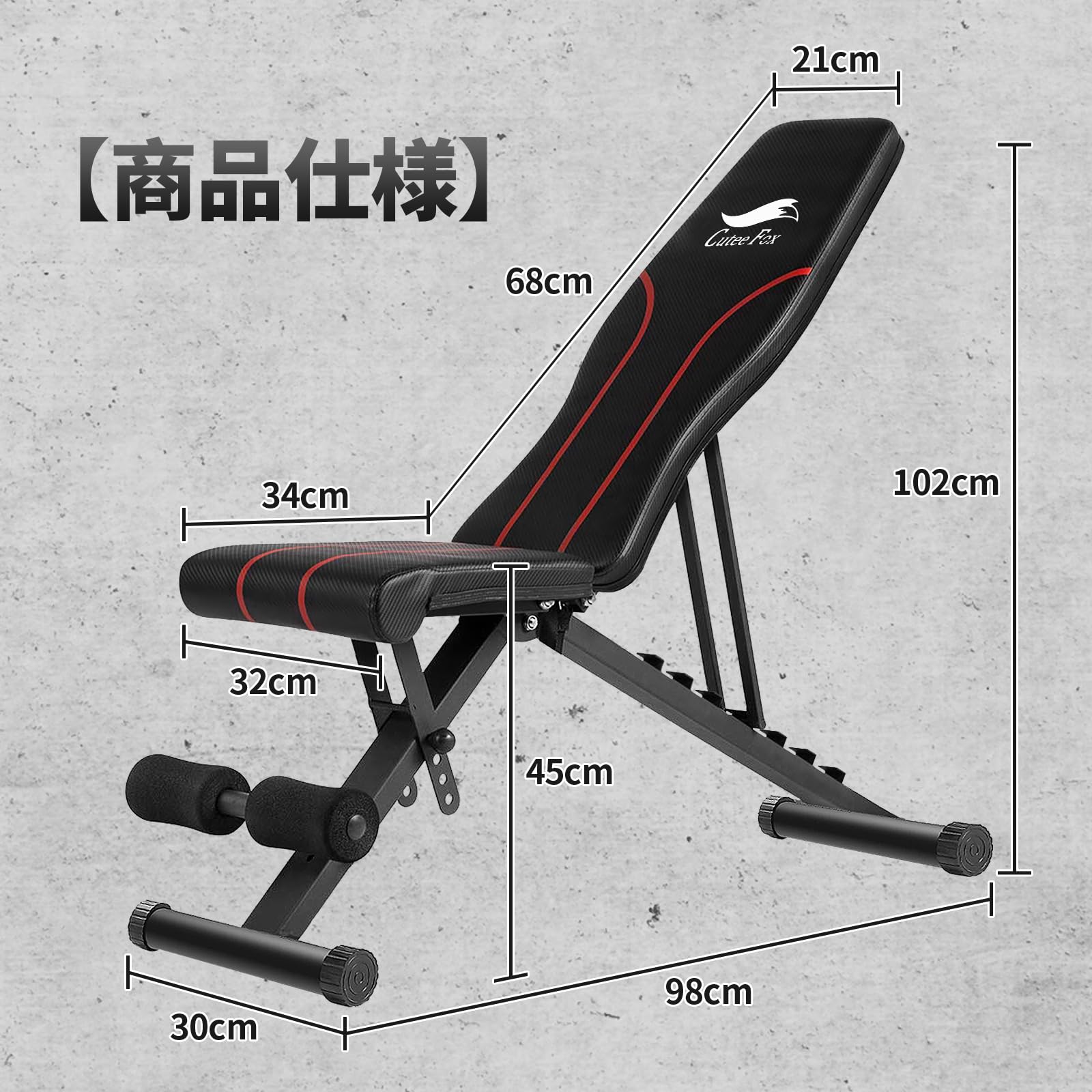 【信頼できる工場&業内トップレベル】2年以上の経験でプロ級スポーツ&アウトドア用品の製造と開発に努め、意匠権も登録しました。世界レベル製造工芸あるサプライヤおよびプロバイダで、品質には配慮がなく、安心にご利用いただけます。【国際検査基準を導入、日本人の安心な品質管理】全ての製品も国際検査基準による全数検査を行い、品質とサポート体制も完備しております。【耐荷重構造】:耐久性のあるインクラインベンチは、頑丈なスチールチューブ製で、ユニークな三角支持構造は運動の間に多機能フラットベンチの安定性を保障します。【高級感】5層構造の厚みクッションを採用しており、衝撃を吸収し、体を保護します。汗で滑りにくく、高品質革を使用しておりますので、 折りたたみアジャスタブルベンチ高級感を滲み出る!耐荷重300KG。【角度調整可能】:一秒で角度調整可能!バックシート7段階、シートクッション4段階、レッグカール3段階!コンパクトなデザインで、鍛えたい部位やメニューに合わせて自由に変更することができます。【調節可能なパイプキャップ】底のパイプキャップは床を傷つけません。パイプキャップに高い面と低い面があり、平ではない地面によって、運動時ダンベルベンチが揺れてバランスが取れない場合は、脚部のキャップを回転し、ダンベルベンチのバランスを調節することができます。【頑丈設計&コンパクト収納】安定感を高めるための衝撃吸収パッドや高重量に耐えられる極太パイプを採用することで荷重に強いフレーム構造を実現。また、トレーニング後は半分に折り畳んでベッド下や押入れに収納できるので、場所を取る心配もありません。【筋トレを自宅で本格的に行える!】これ一台で圧倒的効果!忙しくてジムに行けない方でも、空いた時間や気の向いたときにすぐに自宅で簡単にトレーニングすることができます。また運動不足のサポート、気分のリフレッシュなどにも最適!【これ一つで鍛え方いろいろ!】胸:ダンベルフライ、肩:ショルダープレス、腹:デクラインシットアップ、腕:インクラインダンベルカール、背中:ワンハンドローイング、脚:ブルガリアンスクワットなど様々な運動がこれ一つで行えます!自宅でお手軽に全身を鍛えられます。
