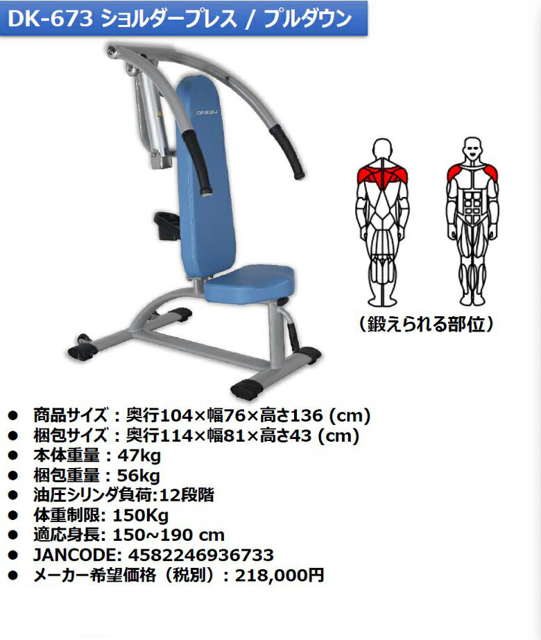 ダイコー 準業務用 油圧式マシン GYMシリーズ ショルダープレス/プルダウン DK-673 油圧 油圧式 フィットネスマシン トレーニングマシン サーキットトレーニング 筋トレ リハビリ 高齢者 機能訓練 健康管理 ダイコウ daikou 大広