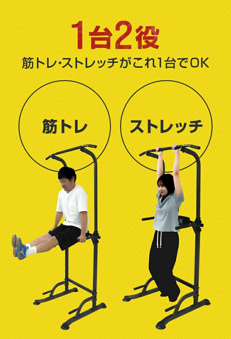 商品説明 この一台があれば筋トレ・健康ストレッチができます! いつでも自宅で本格的な筋トレをしませんか♪ \こんな特徴があります!/ ◎つかみやすい太さのハンドルバー! ◎ウエストパッド付で腰への負担を少なく! ◎最適な厚さと滑り止めグリップ付き! ◎11段階の高さ調節! 懸垂(チンニング)はもちろん、プッシュアップ、ディップス、レッグレイズなど、 マルチに鍛えることができます。 膝や腰への負担も少ないので、ダイエットやリハビリにも最適です! ぶら下がり健康器として使用頂けば、基礎代謝の向上や、リラックス効果に♪ マシンの高さは身長によって調節できるので、家族みんなで使えます! 商品の運搬や組み立ては、女性やお年寄りも楽々♪ 省スペース設計で大場所を取らず邪魔にならないため、いつでも自宅で複数の本格的な筋トレが行えるトレーニングマシンです! \こんなトレーニングができます!/ ディップス・チンニング・レッグレイズ・ヒップアップ 大胸筋・背筋・腰筋・肩筋・上腕筋・二頭筋・三頭筋・腹筋・大臀筋等のトレーニング ジムに出なくても、自宅で好きな時間、空いた時間に筋肉を鍛えましょう♪ 商品仕様 カラー:ブラック サイズ:(約)幅76cm×高さ210cm×奥行80cm 収納サイズ:(約)147cm×97cm×80cm 重量:(約)12.5kg 耐荷重:(約)150kg 素材:スチールパイプ、合成皮革、ポリ塩化ビニル、スポンジ ポリプロピレン 商品内容 本体×1 保護マット×1 エクササイズバンド×1 取扱説明書×1 単4乾電池 ×1 保証期間 30日間 ※商品到着後30日以内の初期不良・破損のみご対応させていただきます。 送料について 送料無料 (本州・四国・九州) こちらの商品は170サイズになります。 注) 北海道・沖縄・離島への発送には別途追加送料が必要です。金額は店舗情報をご確認ください。ご注文時には追加送料は加算されておりません。 注) ◇同梱での発送は原則として同日購入の商品のみ対応致します(同梱不可商品との同梱はできません)。 ◇サイズ、重さによって料金、発送口数が変わることがあります。 ◇他のIDとの同梱は出来ません。 ◇梱包のダンボール箱等は再利用しております。 見栄えが多少悪いですが、お客様の負担を少しでも節減する為に努力しております。 お支払について ★代金引換 代引きでのご購入は出来ません。 ★銀行振り込み (お支払い金額=購入金額) ★カード決済/銀行振り込み (お支払い金額=商品金額) 振込手数料は御客様負担となります。 商品取り扱い注意事項 ●代引きでのご購入は出来ませんのでご了承ください。 ●ご使用中の揺れることを避けるために、組立中にネジをしっかり締めないでください。すべての部品が組み立てできたら、一回で全部のネジをしっかり締めてください。 ●一部の部品に曲げ加工時に窪みがある場合があります。製品の強度や安全性に問題はありませんので、ご安心ください。 ●海外製品で、簡易梱包での輸入のため風防に擦れや多少の小キズなどがある場合がございますが、商品自体には問題ありませんのでご了承下さい。 ●商品を使用して発生した事故・トラブル・破損等につきましては一切の責任を負いかねます。 ●商品は、モニターによって色合いが異なって見える場合があります。 ●仕様・デザインは改良のため予告なく変更することがあります。 ●配達地域や交通事情等により、希望配達日時にお届けできない場合がございます。あらかじめご了承ください。