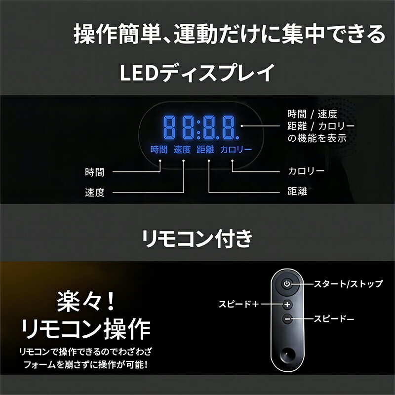 【製品仕様】 本体重量:20kg 耐荷重:100kg 速度範囲:0.5~6km/h 最大連続使用時間:120分 【ルームランナー 家庭用 電動 静音】 ハイスペックのモーターを採用しており、 静音性(50db)が高いため、 マンション内でも自宅で手軽にウォーキングができます。 【独自の衝撃吸収システム】 走行板に特別なクッションを搭載しているので、 衝撃を吸収し、膝に優しい走りを実現することができます。 【わかりやすいパネル】 便利表示パネルが付属しています。 時間、カロリー、スピード、走った距離などを記録できます。 余計な機能を省いたシンプルでわかりやすい表示なので、 高齢者でも使いやすい。 【収納便利】 最も厚い部分でわずか10cmの厚さの薄型デザイン。 ソファやベッドの下に簡単に置くことができます。 また、壁際に立てて収納することも可能です。 キャスター付きで、女性でも簡単に移動できます! 【操作簡単】 操作は簡単でリモコンで電源をON/OFFし、 速度を変更するだけなので、 幅広い年齢や目的の方にご対応いたしております。 無駄な機能はありません! 【安全仕様&広幅走行面】 安全キーが搭載、服などに装着すると、 転倒や滑りなどの緊急時にランニングマシンを即座に停止することができます。 100cm* 38cm もある大きい走行面、 ガタイのいい成人男性でも余裕に走れるサイズ! 踏み外すことがありません!耐荷重は100kgもあり、安定感が抜群です。 初心者でも安心して使えます!