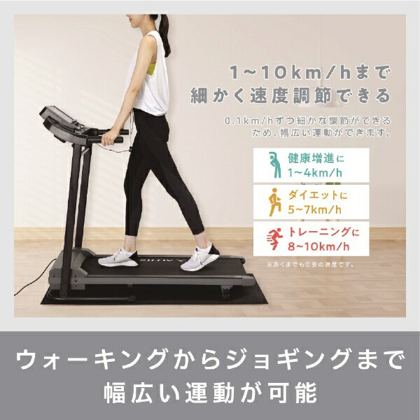 ウォーキングからジョギングまで幅広い運動が可能最高速度は10km/h連続使用時間60分耐荷重100kgワンタッチ速度調節ボタン付傾斜角度3段階12種類のプログラムコース内蔵グリップセンサーで心拍数測定タブレットトレー付●速度1〜10km/h ●傾斜角度3段階調節(約1度、2度、3度) ●折りたたみ収納可能 ●クールダウンボタン ●ワンタッチ速度調節ボタン(4km/6km/8km)) ●小物・ボトルホルダー付 ●移動用キャスター