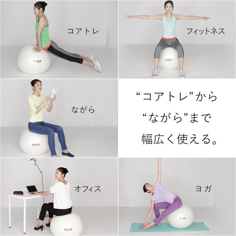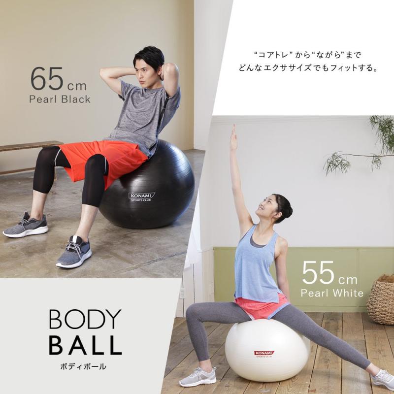 コナミスポーツクラブ ボディボール/バランスボール"コアトレ"から"ながら"まで どんなエクササイズでもフィットする【すべりにくい表面グリップ力】【身体が沈みすぎない反発力】【破れてもゆっくり空気が抜ける安全性】ボディボールは、体幹部の筋力強化やバランス力の向上を目的とした運動をするのに適したツールとなります。 ボディボールを使ってエクササイズをはじめましょう【サイズ】直径55cm/65cm 【適正身長】145~165cm / 165cm~ 【本体質量】約900g / 約1,100g 【耐荷重】300kg【素材】PVC 【カラー】パールホワイト / パールブラック 【付属品】ハンドポンプ 、メジャー、ピン(栓) 【生産国】台湾