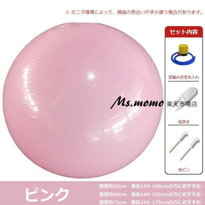【カラー】ブルー、グリーン、パープル、ピンク【素材】PVC【セット内容】バランスボール、足踏み式空気入れ、栓抜き、栓ピン【サイズ】直径約55cm/身長150-160cmの方におすすめ直径約65cm/身長160-165cmの方におすすめ直径約75cm/身長165-175cmの方におすすめ身体のゆがみ解消体幹部だけではなく、普段使わない小さな筋肉を使用します。手軽にできるイスの変わりにバランスボールを使ってもOK!テレビを見ながら座っているだけでもエクササイズ効果があります。室内で出来るので天気に関係なく行う事が出来るのも魅力の一つです。注意事項:※ 平置き素人採寸ですので多少の誤差はご容赦下さい。※ モニタ環境によって、商品の色合いが多少違う場合があります。※ 少々匂いがありますが、置いたままで2-3日くらいになくなりますので、ご安心ください。※ 発送時も簡易梱包の為、お受け取り時にたたみ皺が有ると思いますが、ご了承ください。バランスボール ヨガボール 55cm ブルー グリーン パープル ピンク 55cm 65cm 75cm