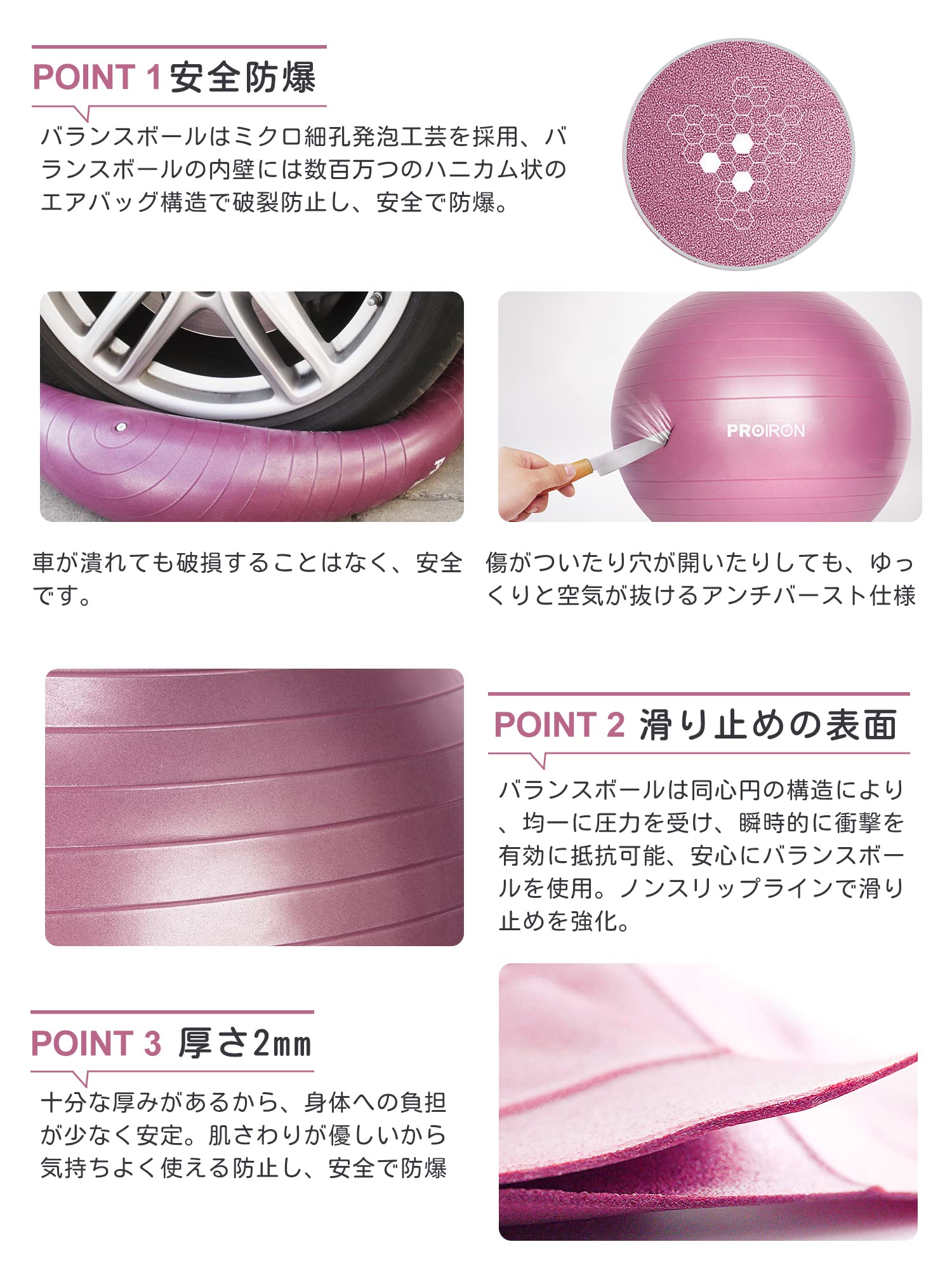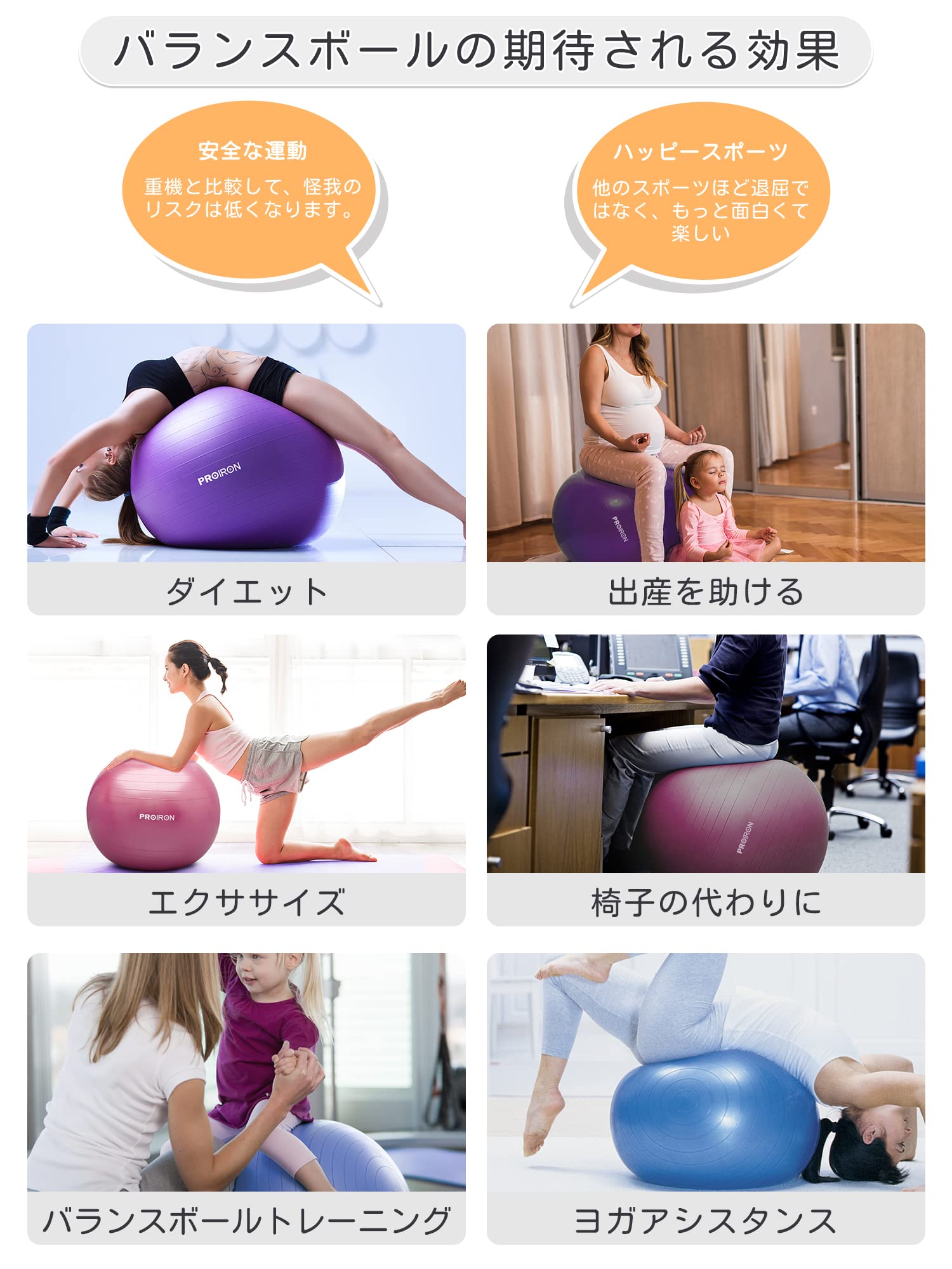 商品情報商品の説明主な仕様 [高品質素材] PROIRONバランスボールは、高品質で厚い2mm PVCで作られています。 3つのファッショナブルな色で利用できます。 使いやすいハンドポンプも含まれています。【SGSによる証明書】 バランスボール55cmの重量は1kg、バランスボール65cmの重量は1.2kg、バランスボール75cmの重量は1.4kgで、市場のほとんどのバランスボールよりも重いです。耐荷重300kg、滑り止め面、真の防爆、安心してご使用ください。【複数の用途】バランスボール(またはジムボールと呼ばれる)は、ワークアウトの一般的で楽しい方法になりつつあります。 姿勢を改善するためのオフィスボールチェアとしての使用に加えて、ヨガトレーニング中のヨガボールまたはピラティスボールとしても使用されます。 また、リハビリ、回復、出産にも使用でき、ストレスを軽減し、心身の改善に役立ちます。