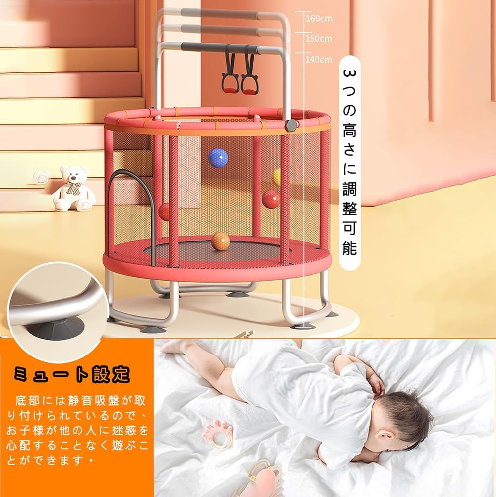 【高品質の素材を使用】高品質のスチールを使用し、最大300KGの荷重に耐えることができ、錆びにくく、耐久性があります。 強化バネを使用しているので飛び跳ねても音がせず、夜間でも使用可能です。 安全ネットも付いているので、力が加わって飛び出す心配もありません。 【安全トランポリン】トランポリンの底部はC型鋼管で作られており、運動中に動きにくく、トランポリンの弾力性のあるゴム部分は高密度のオックスフォード布で覆われています。 足を痛めることを心配せずに、思う存分ジャンプしましょう。 本製品の耐荷重は300kgで、大人と子供が同時に遊ぶことができます。 【身体運動】子供たちはもともと走ったりジャンプしたりするのが好きで、トランポリンでは運動能力を最大限に発揮できます。 肥満の子供でも、体重を減らしたいだけジャンプできます。 【滑り止めグリップとサスペンションリング】お子様の身長に合わせてトランポリンの高さを3段階に調整でき、アームレストは取り外し可能な高品質のソフトグリップを使用しており、滑りにくく握りやすいです。グリップには吊り輪が付いており、吊り輪はお子様の身長の成長に大きく役立ちます。 【実用的なトランポリン】室内での使用に適しており、屋外スペースに依存せず、天候が悪くても室内で遊ぶことができ、保育園、幼稚園、施設などの遊び場にも適しています。