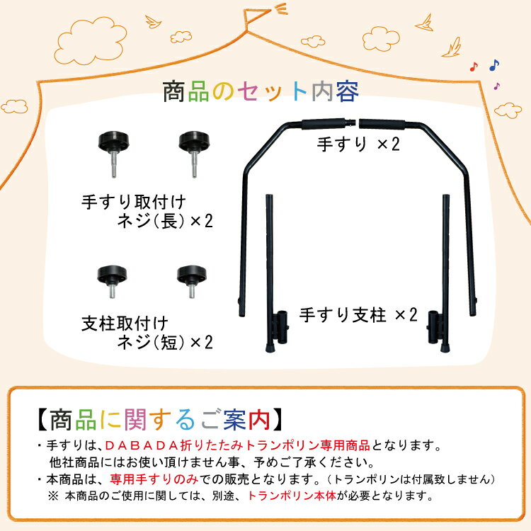 【商品の仕様】 本体サイズ(約):108cm〜128cm(3段階で10cmずつ高さ調整が可能) ※商品によっては若干の誤差が生じる場合がございます。 耐荷重:80kgまで ※商品のデザイン、仕様、価格は予告なく変更する場合がございますのでご了承ください。 【商品に関するご案内】 ・本商品は、【DABADA折りたたみトランポリン】専用の手すりとなります。 ※他社製品へのご使用はいただけません。 ・本商品は、専用手すりのみでの販売となります。 ※本商品のご使用には、別途、トランポリン本体が必要となります。 ※商品によって若干の誤差があります。 【手すりご使用の注意点】 ・商品の組み立て・ご使用の前に、必ず取り扱い説明書の注意事項等をお読み下さい。 ・手すりは、あくまで跳躍を補助するものであり、ぶら下がったり、物を置いたり、 ・本来の用途以外でのご使用はお控えください。危険行為はお止めください。 ・輸入品のため小傷がある場合がございます。予めご了承ください。 メーカー希望小売価格はメーカーカタログに基づいて掲載しています スッキリで紹介されました!トランポリン 専用 手すり 取外し可能 てすり 補助 補助道具 支え ささえ 折りたたみ 折り畳み コンパクト 家庭用トランポリン とらんぽりん エクササイズ ダイエット フィットネス 有酸素運動 運動不足解消 体感トレーニング ワークアウト ゆるジャンプ 遊具 キッズ 交換パーツ 部品 取り換え◆日本テレビ情報番組『スッキリ』でDABADAのトランポリンが紹介されました!◆ ※この動画は許諾を得て掲載しています。