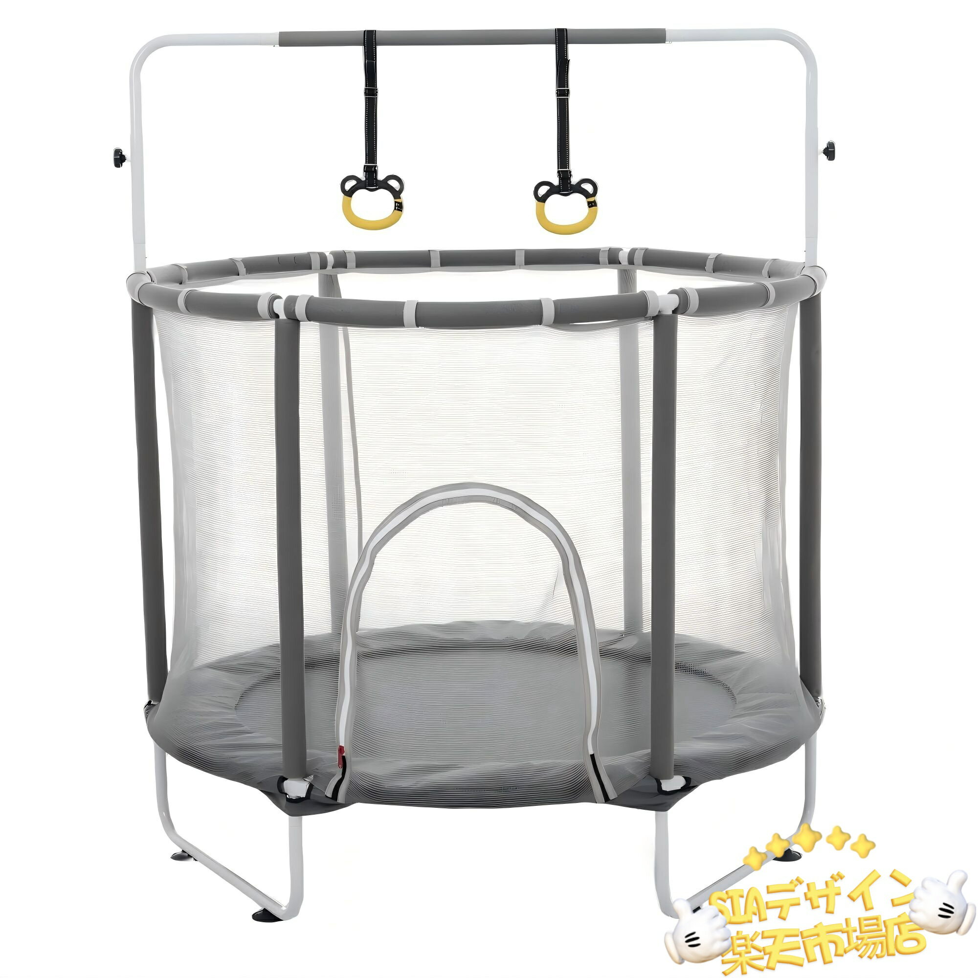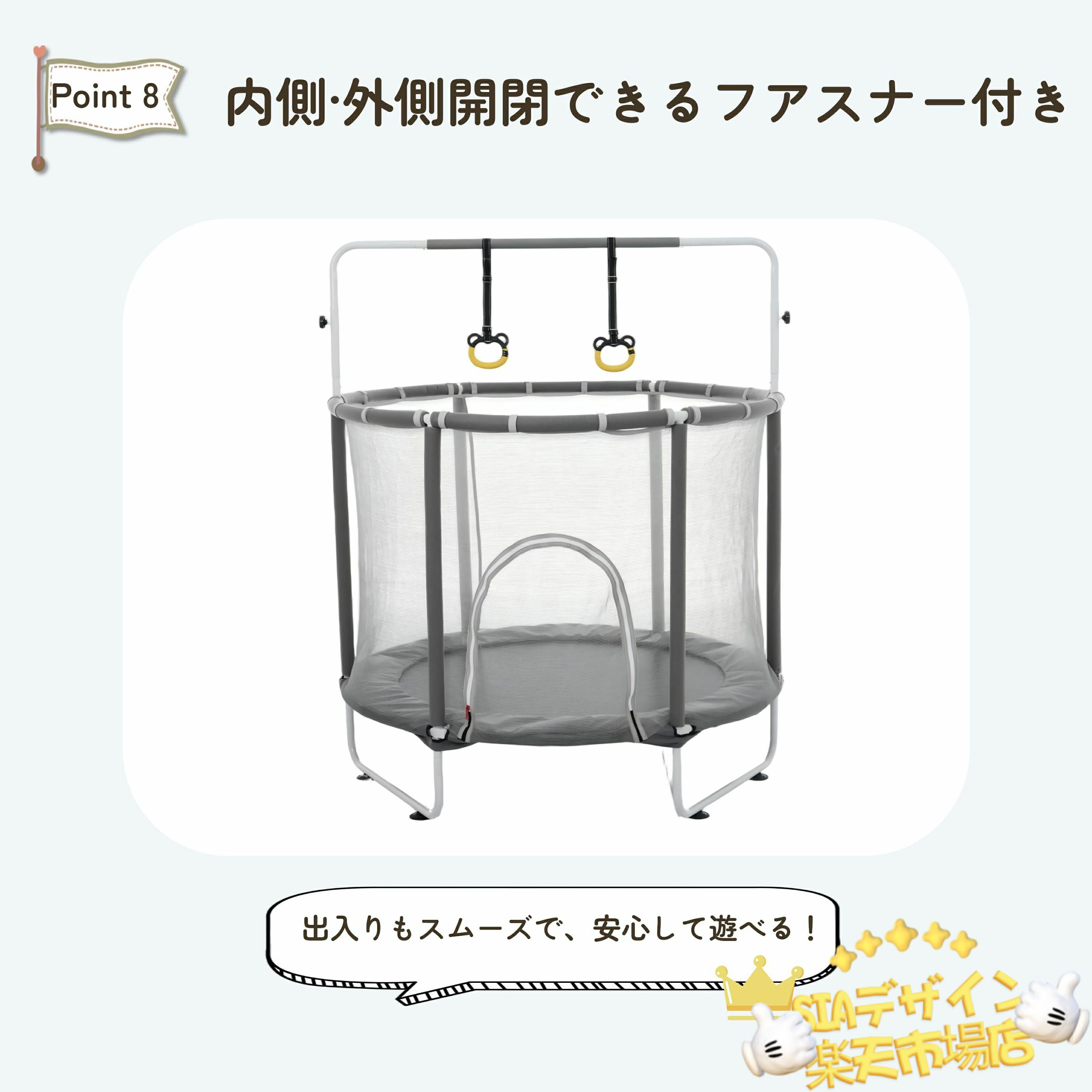 【広々スペースで思い切り遊ぼう!】幅約142cmのトランポリン2人でも一緒に楽しめるゆったりサイズ。お友だちと元気いっぱいジャンプ!【安全設計こだわりボイント】安全ネット付きで安心感UP飛んでもぶつかっても大丈夫、思い切り遊べる!お子さまの様子が見えて安心!周りはネットで囲まれていて、入り口はジッパー式。飛び出しの心配もなし!360°しっかりガードで、安心して遊べる♪お子さまにやさしい無毒素材安心して遊べる無毒素材を使用、肌にやさしく長時間遊んでも安心毎日の遊びでも安全、家族みんなが笑顔になるトランポリン【高品質強化スプリング】耐久性と?力アップ!思いっきりジャンプ!ギンギンならない静音設計、ジャンプ時の音も最小限に 36本のスプリングでジャンプ力アップ!36本の強力スプリングが、驚きの弾力を実現!お子さまの元気なジャンプを支え、長時間遊んでも安定感抜群!安全性を重視しながら、全力で楽しむことができる、最高の跳ね心地!やわらかクッションでしっかりガード!鉄パイプの外側にEPE素材クッションを装備お子さまがぶつかってもケガしにくく、安全に遊べる? 弾力があって衝撃を吸収? 変形しにくく長持ち バネ部分をカバーで保護足元を気にせず思いっきりジャンプできる設計【高さ調節可能な吊り輪付き】吊り輪はお子さまの身長に合わせて自由に高さ調節OK成長に合わせて長く使えてる ?腕や手の力をバランスよく育てる?体の中心をしっかり鍛えて、姿勢も安定?全身を動かして、運動センスを伸ばす?楽しく遊びながら、自然に体が成長!内??外側開閉できるフアスナー付き出入りもスムーズで、安心して遊べる!ゴム製の脚キャップ採用ジャンプ時の騒音を抑え、床もキズつきにくい