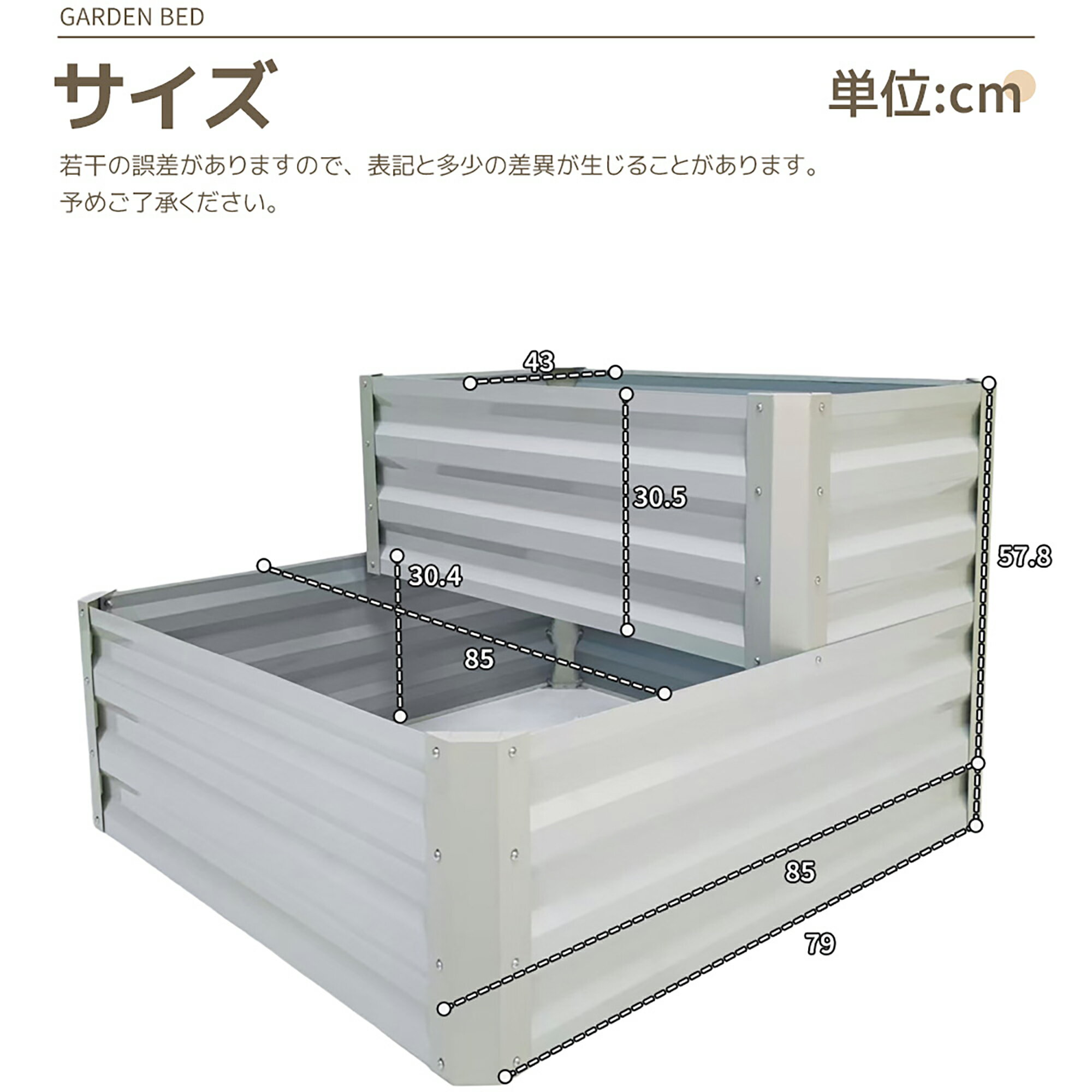 【⭐ガーデニングを快適にする7つのポイント】✅たっぷりの土量で、植物を余裕をもって育てられる。✅二層の高さで、植物ごとに土の深さを自由に調整できる。✅高さ差で庭やベランダに自然な立体感を演出する。✅ぶつかっても安心の安全設計。✅底部スリットで通気・排水性を高め、健康な根を守る。✅錆びにくく、無公害設計で植物にも安心。✅工具少なめで、短時間に組み立て可能。 【⭐大容量で育てやすい!】土の量をしっかり確保した設計で、植物ごとに余裕をもって育てられます。庭やベランダに自然な豊かさを添える一品です。 【⭐土壌管理も自由自在!】二層の高さで土を自由に操る!下段30cmは草花に、上段58cmは根深い野菜や観葉植物もぐんぐん育つ。庭に理想のレイヤーガーデンを。下段30cm:適した草花やハーブを育てる!例:ラベンダー、バジル、タイムなど上段58cm:美しい花を育てる!例:チューリップ、ダリア、ペチュニアなど 【⭐ぶつかっても安心の安全設計。】角を直角にしていない設計で、、作業中に体が当たってもケガしにくい仕様です。 【⭐底部オープン構造で根を守る】✅ 土壌の通気性を向上し、根の呼吸を助ける✅ 排水性が良く、過湿による根腐れを防ぐ✅ 土の圧迫を軽減し、植物がのびのび成長できる✅ 健康な根系を維持し、長く育てやすい ✅ カラー鋼板で安心・丈夫✅ 塗装仕上げで錆びにくく、長く屋外で使用可能✅ 丈夫な構造で植物や土をしっかり支える✅ 無公害設計で植物にも安心 【簡単組み立てで手間いらず】工具少なめでスムーズに組み立て可能部品がしっかり設計されており、安定した完成度