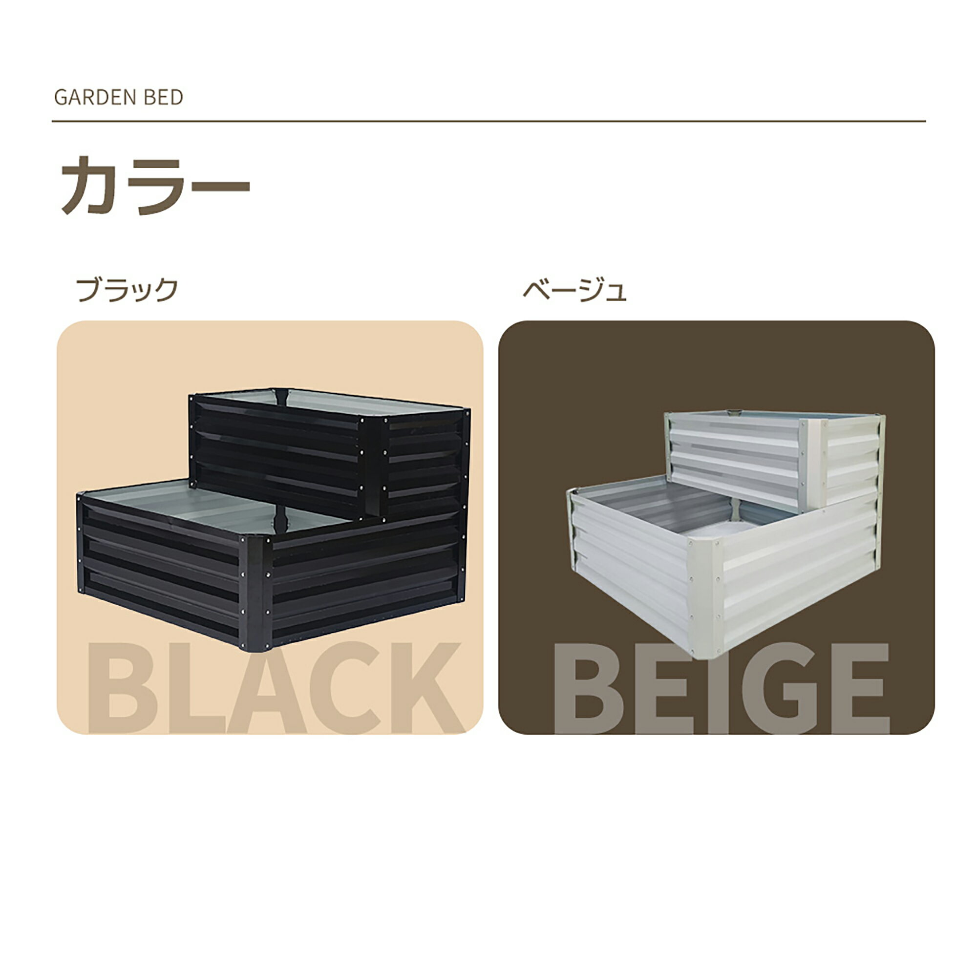 【ガーデニングを快適にする7つのポイント】たっぷりの土量で、植物を余裕をもって育てられる。二層の高さで、植物ごとに土の深さを自由に調整できる。高さ差で庭やベランダに自然な立体感を演出する。ぶつかっても安心の安全設計。底部スリットで通気・排水性を高め、健康な根を守る。錆びにくく、無公害設計で植物にも安心。工具少なめで、短時間に組み立て可能。 【大容量で育てやすい!】土の量をしっかり確保した設計で、植物ごとに余裕をもって育てられます。庭やベランダに自然な豊かさを添える一品です。 【土壌管理も自由自在!】二層の高さで土を自由に操る!下段30cmは草花に、上段58cmは根深い野菜や観葉植物もぐんぐん育つ。庭に理想のレイヤーガーデンを。下段30cm:適した草花やハーブを育てる!例:ラベンダー、バジル、タイムなど上段58cm:美しい花を育てる!例:チューリップ、ダリア、ペチュニアなど 【ぶつかっても安心の安全設計。】角を直角にしていない設計で、、作業中に体が当たってもケガしにくい仕様です。 【底部オープン構造で根を守る】 土壌の通気性を向上し、根の呼吸を助ける 排水性が良く、過湿による根腐れを防ぐ 土の圧迫を軽減し、植物がのびのび成長できる 健康な根系を維持し、長く育てやすい カラー鋼板で安心・丈夫 塗装仕上げで錆びにくく、長く屋外で使用可能 丈夫な構造で植物や土をしっかり支える 無公害設計で植物にも安心 【簡単組み立てで手間いらず】工具少なめでスムーズに組み立て可能部品がしっかり設計されており、安定した完成度
