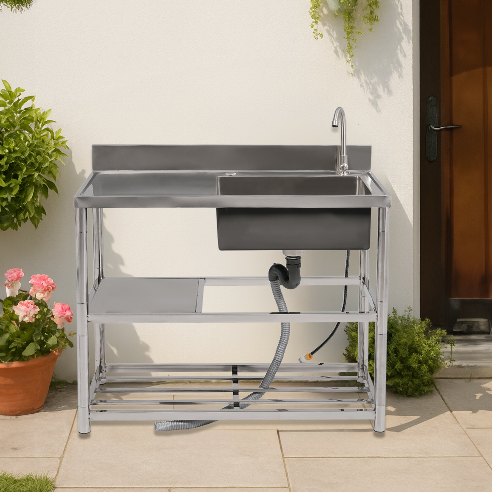◎01【清潔で快適な屋外作業に】サビに強いステンレス製の屋外シンクです。ガーデニングやBBQの準備、ペットの足洗いなど、屋外でのちょっとした洗い物にとても便利です。丈夫でサビにくい素材を使用しており、雨ざらしの場所でも安心して長くご使用いただけます。シンプルで使いやすいデザインで、毎日の暮らしをより快適にサポートします。 ◎02【豊富な付属品付きで便利!】届いてすぐに組み立てていただけます。(フレキホース)(蛇口アダプター) (排水セット)(ステンレス製单水栓蛇口)(S型排水木一ス)(コネクター)ル(シーテープ)(軍手) ◎03【ステンレス製で錆びに強く、お手入れ簡単】耐久性に優れ、錆びにくいため、屋外でも安心してお使いいただけます。汚れがつきにくく、お手入れもラクラクです。 ◎04【手洗い・洗い物に便利な深型シンク】約19cmの深型シンクで、水ハネしにくく快適にお使いいただけます。【便利な作業台付きで、さらに使いやすく】野菜や果物を切ったり、小物を置いたりと、ちょっとした作業に便利なスペースを備えています。 ◎05【包丁収納に便利なナイフラック付き】使用後の包丁をサッと収納でき、作業スペースを広く保てます。安全面でも安心です。【左右選べる蛇口位置】蛇口の位置は左右どちらでも選べ、使い勝手に合わせて調整できます。【収納棚付きでスッキリ省スペース】収納棚付きなので、洗剤や洗い物用品をすっきりまとめて、省スペースで保管できます。 ◎06【匂いやサビが発生しにくい設計】汚れに強く、匂いが残りにくい構造で、清潔にお使いいただけます。(防水シーりングカバー)(ごみ受けカゴ)(ステンレスカップ本体)(上部ゴムリング)(下部ゴムリング)(ABSプラスチックナット)【S字トラップで匂い・虫をブロック】排水にS字トラップを採用し、下水の匂いや虫の侵入を防ぎます。 ◎06【丈夫な編み込みホースで安心接続】黄色パーツ付きで、ナットの締め付けも簡単。スムーズに接続できます。形状に合わせて調整可能な蛇口アダプター付き。多種蛇口に対応し安心して使えます。おまけとしてコネクターをもう1個同梱しています。対応ホース(内径16mm 外径20mm)は付属なし・市販品をご用意ください。style="width: 40%;line-height:24px;padding: 12px 16px;background: #F7F8FA;border-right: 1px solid #E5E5E5;border-bottom: 1px solid #E5E5E5;word-break: break-word;white-space: pre-wrap">・素材style="width: 60%;line-height:18px;padding: 12px 16px;border-bottom: 1px solid #E5E5E5;word-break: break-word;white-space: pre-wrap">スチールstyle="width: 40%;line-height:24px;padding: 12px 16px;background: #F7F8FA;border-right: 1px solid #E5E5E5;border-bottom: 1px solid #E5E5E5;word-break: break-word;white-space: pre-wrap">・カラーstyle="width: 60%;line-height:18px;padding: 12px 16px;border-bottom: 1px solid #E5E5E5;word-break: break-word;white-space: pre-wrap">シルバーstyle="width: 40%;line-height:24px;padding: 12px 16px;background: #F7F8FA;border-right: 1px solid #E5E5E5;border-bottom: 1px solid #E5E5E5;word-break: break-word;white-space: pre-wrap">・商品サイズstyle="width: 60%;line-height:18px;padding: 12px 16px;border-bottom: 1px solid #E5E5E5;word-break: break-word;white-space: pre-wrap">L100xW50xH90.5cmstyle="width: 40%;line-height:24px;padding: 12px 16px;background: #F7F8FA;border-right: 1px solid #E5E5E5;border-bottom: 1px solid #E5E5E5;word-break: break-word;white-space: pre-wrap">・梱包数style="width: 60%;line-height:18px;padding: 12px 16px;border-bottom: 1px solid #E5E5E5;word-break: break-word;white-space: pre-wrap">1style="width: 40%;line-height:24px;padding: 12px 16px;background: #F7F8FA;border-right: 1px solid #E5E5E5;border-bottom: 1px solid #E5E5E5;word-break: break-word;white-space: pre-wrap">・梱包サイズstyle="width: 60%;line-height:18px;padding: 12px 16px;border-bottom: 1px solid #E5E5E5;word-break: break-word;white-space: pre-wrap">105*55*36cmstyle="width: 40%;line-height:24px;padding: 12px 16px;background: #F7F8FA;border-right: 1px solid #E5E5E5;border-bottom: 1px solid #E5E5E5;word-break: break-word;white-space: pre-wrap">・重量(N.W.)style="width: 60%;line-height:18px;padding: 12px 16px;border-bottom: 1px solid #E5E5E5;word-break: break-word;white-space: pre-wrap">20KGstyle="width: 40%;line-height:24px;padding: 12px 16px;background: #F7F8FA;border-right: 1px solid #E5E5E5;border-bottom: 1px solid #E5E5E5;word-break: break-word;white-space: pre-wrap">・重量(G.W.)style="width: 60%;line-height:18px;padding: 12px 16px;border-bottom: 1px solid #E5E5E5;word-break: break-word;white-space: pre-wrap">22KGstyle="width: 40%;line-height:24px;padding: 12px 16px;background: #F7F8FA;border-right: 1px solid #E5E5E5;border-bottom: 1px solid #E5E5E5;word-break: break-word;white-space: pre-wrap">・生産国style="width: 60%;line-height:18px;padding: 12px 16px;border-bottom: 1px solid #E5E5E5;word-break: break-word;white-space: pre-wrap">中国style="width: 40%;line-height:24px;padding: 12px 16px;background: #F7F8FA;border-right: 1px solid #E5E5E5;border-bottom: 1px solid #E5E5E5;word-break: break-word;white-space: pre-wrap">・組立品/完成品style="width: 60%;line-height:18px;padding: 12px 16px;border-bottom: 1px solid #E5E5E5;word-break: break-word;white-space: pre-wrap">組立品