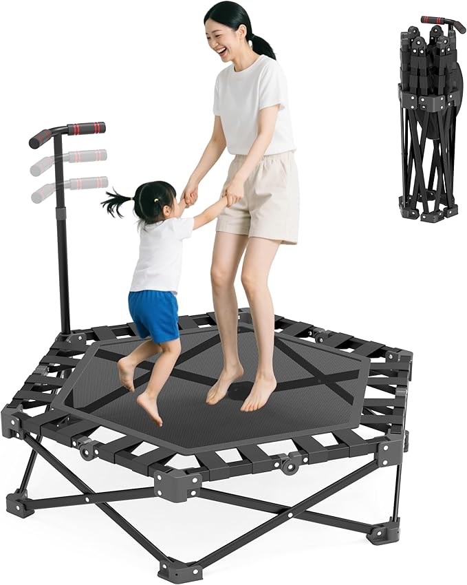 トランポリン 折りたたみ 手すり付き 大判 耐荷重300kg 静音 男の子 女の子キッズ 大人用 6本脚 ダイエット 子供 子供用 家庭用 室内 高さ調整 手すり スポーツ コンパクト収納 組み立て式 あそび プレゼント ギフト おもちゃ